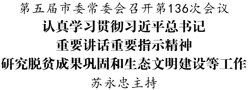 11月5日,第五届市委常委会召开第136次会议。11月5日,第五届市委常委会召开第136次会议,认真学习贯彻习近平总书记近期重要讲话重要指示精神,提出我市贯彻意见;研究脱贫成果巩固、生态文明建设等工作。