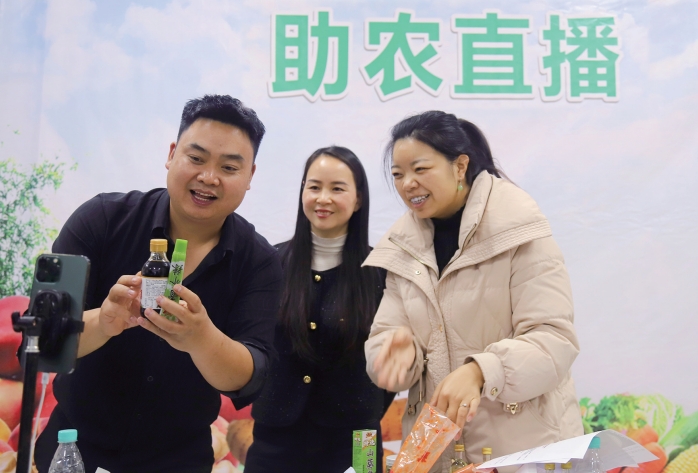 近年来,为破解农产品“出村进城”难题,威信县整合本土电商人才资源,创新“电商+产业+人才”模式,打通农特产品线上销售渠道,助力产业发展、群众增收。图为威信县电商人才在直播间推介农特产品。