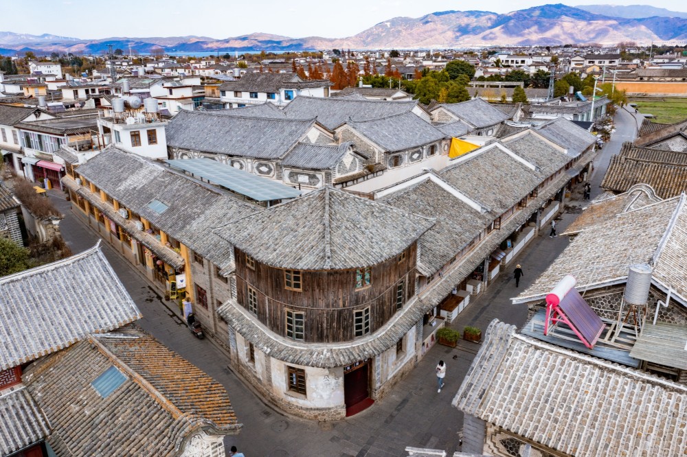 走得差不多了,我们接下来转个场,往北边大概20公里,就到了非常有名的喜洲古镇。喜洲古镇东临洱海,西枕苍山,非常好地保存下来了白族民居建筑群,从布局上看是典型的“三坊一照壁”以及“四合五天井”的白族庭院格局。民居雕梁画栋、斗拱重叠、翘角飞檐,门楼、照壁、山墙的彩画装饰艺术绚丽多姿,体现了白族人民的建筑才华和艺术创造力。古戏台、本主庙等历史建筑得到修缮,白族服饰、扎染技艺等民俗活动延续至今,各地游客纷至沓来。