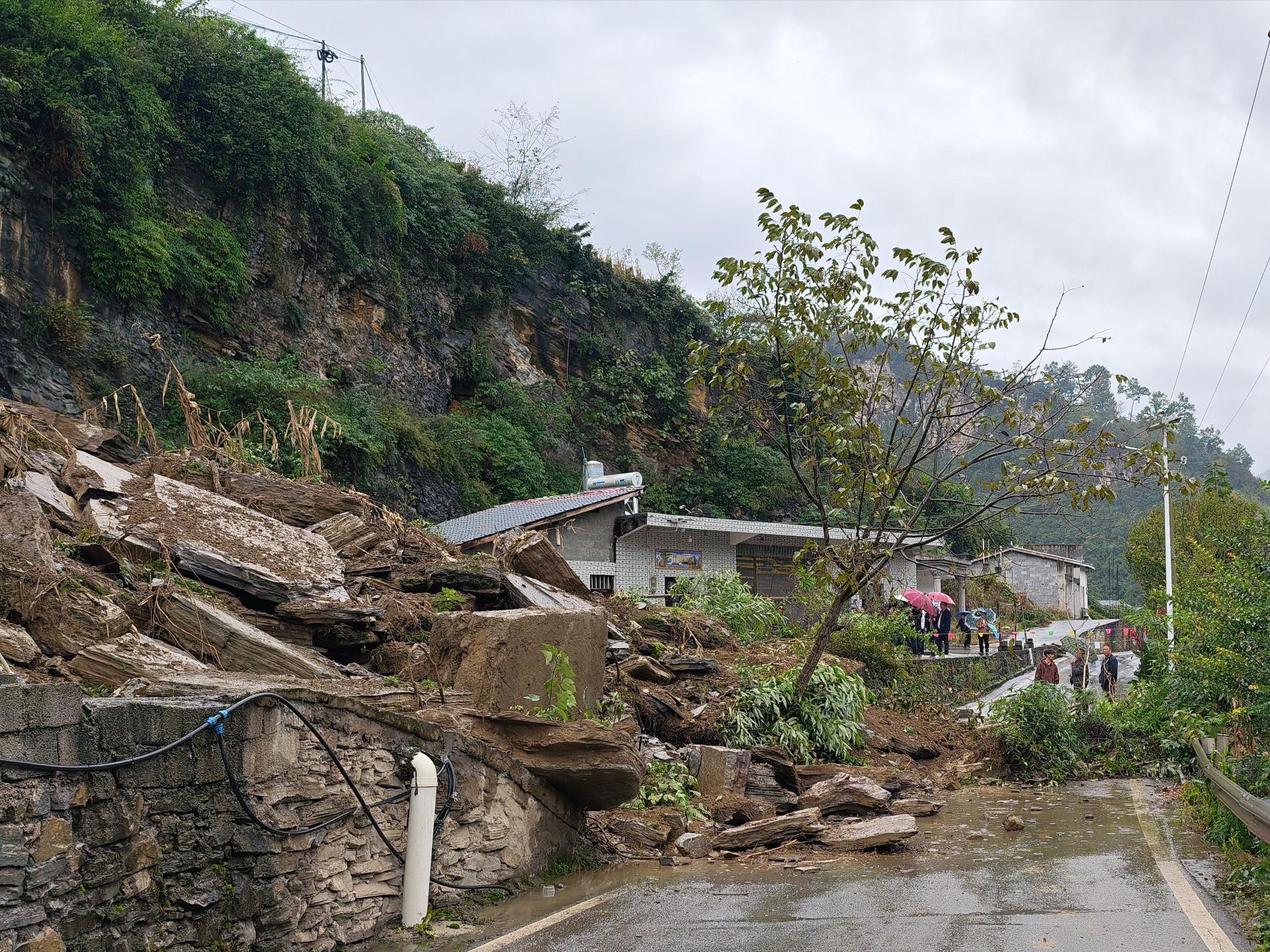 尚未抵达滑坡现场,笔者便看到当地设置的警戒线,提醒过往车辆绕路通行。在现场,镇雄县自然资源局、大湾镇、雨萨村各级党员干部正冒雨帮助农户转移家中物品、清理堆积的土方和石块。