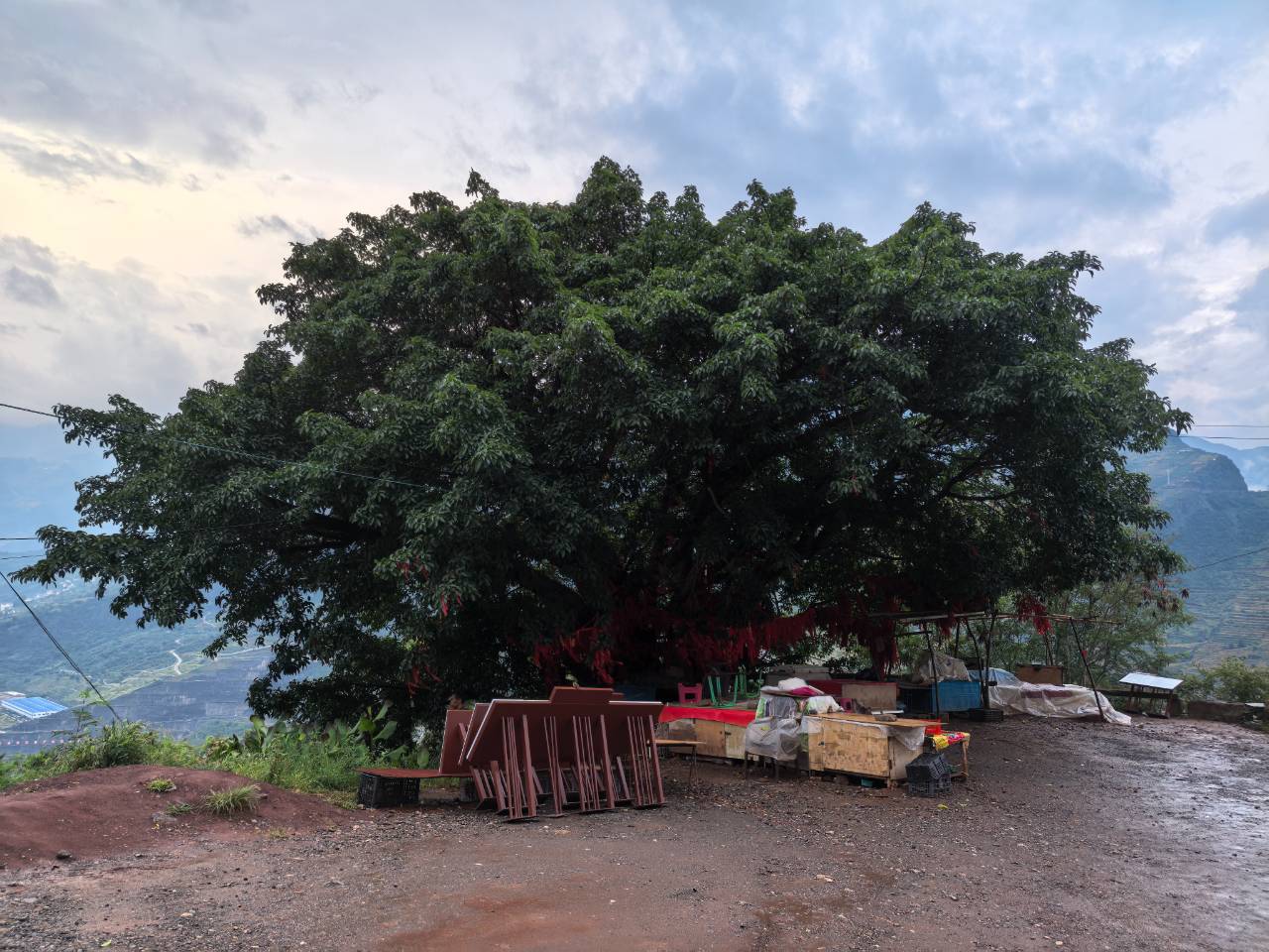 我们入住的“半山酒店”,住宿条件不输县城。采访结束后,店家推荐我们去看看镇外不远处的古树与白鹤驿道。步行约20分钟,一株20米高、冠如华盖的古树跃入眼帘,枝头红绸飘动。树荫下,几位老人守着摆满土特产的小摊,静候游客。古树一侧,便是声名在外的白鹤驿道。