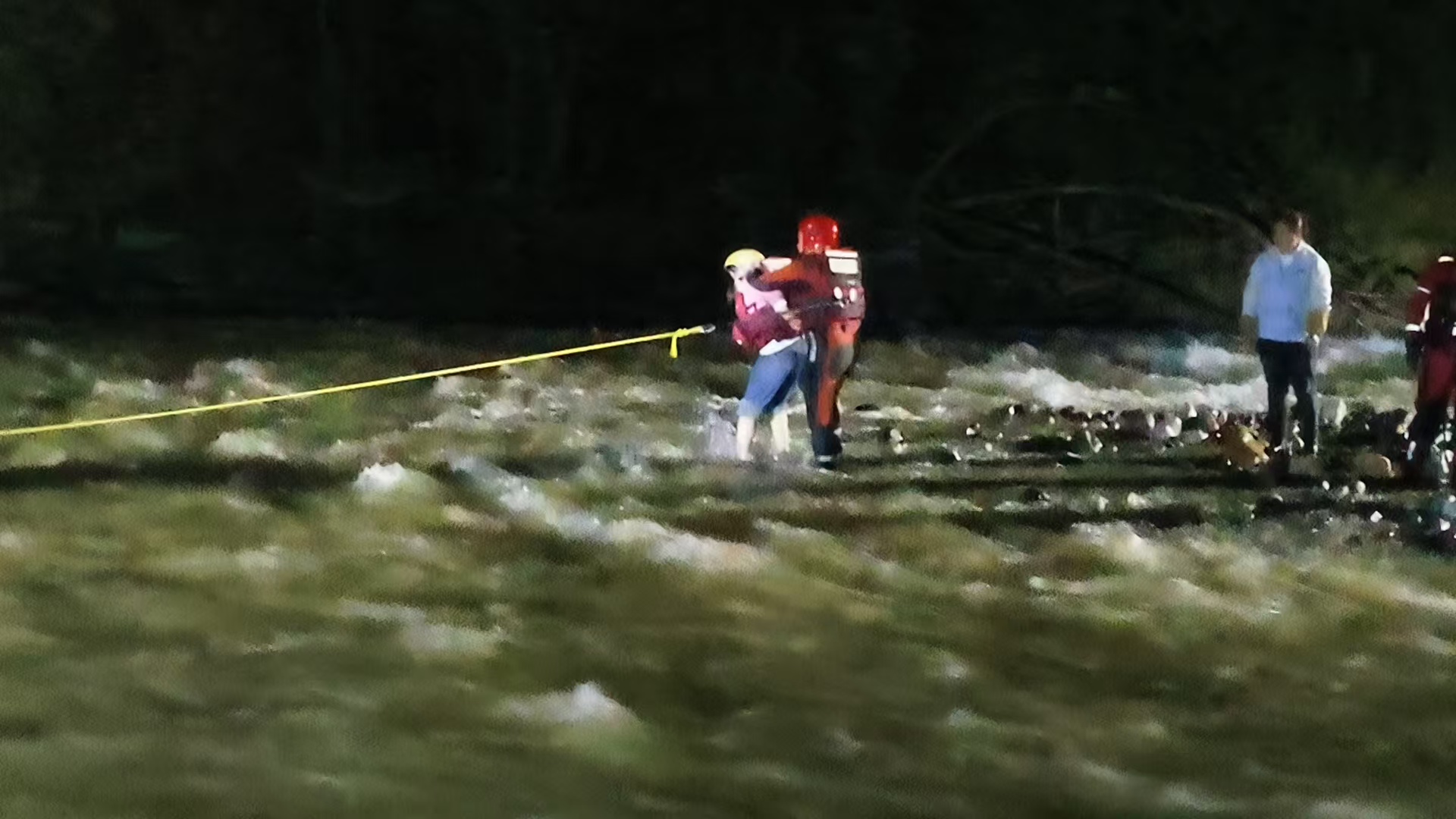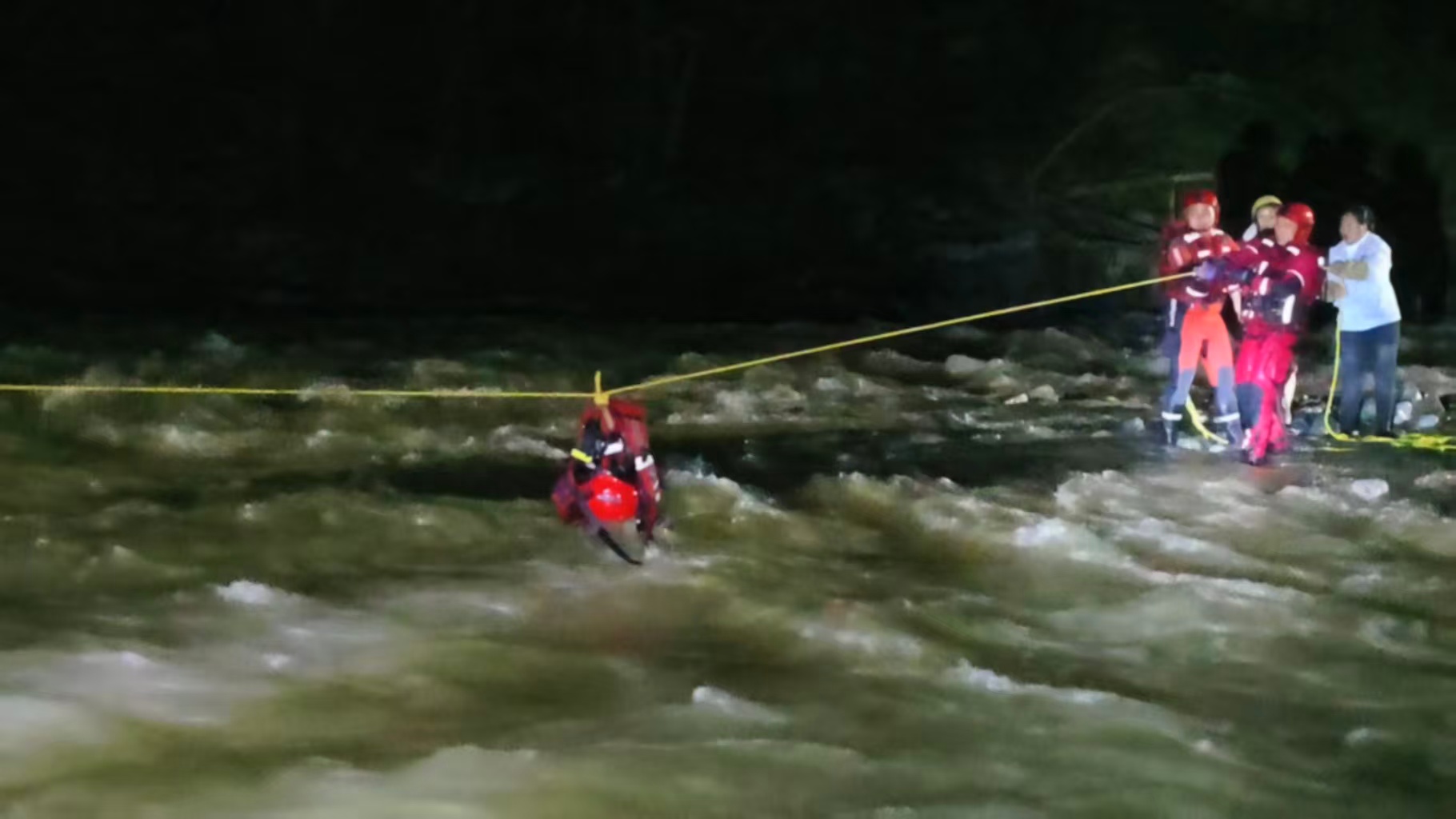 19时07分,大队救援人员到达现场。通过悦乐镇专职消防队负责人汇报和现场侦察,4名被困人员位于河道中间,距离岸边约10米,水流湍急。根据现场情况,指挥员果断制定“活饵救援”方案:在上游安排1名观察手实时监测水流及周边环境;下游设置2名安全确保手,筑牢安全防线;辅助人员将绳包一端连接攻击手牛尾绳,做好救援准备。方案制定后,救援行动随即展开,第一名攻击手身系安全绳,朝向上游45度角平稳跳入水中,奋力向被困人员靠近。岸边辅助人员精准控制绳索释放速度,确保攻击手安全推进。攻击手抵达被困人员位置后,第二名攻击手沿相同路线跟进。随后,岸边人员通过绳索将救生衣(PFD)运送至攻击手手中,攻击手迅速为被困人员穿戴好救生衣,并将其与自身牛尾绳牢固连接。检查无误后,攻击手双手紧握被困人员救生衣肩带,双腿紧紧夹住对方,让其身体尽量贴近自己,形成有效保护。岸边确保人员则利用钟摆原理,缓慢将被困人员和攻击手一同拉向安全区域。经过1小时17分钟的紧张救援,救援人员依次将4名被困人员转移至岸边。