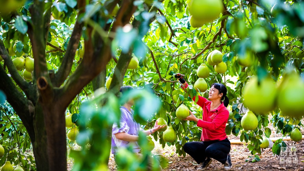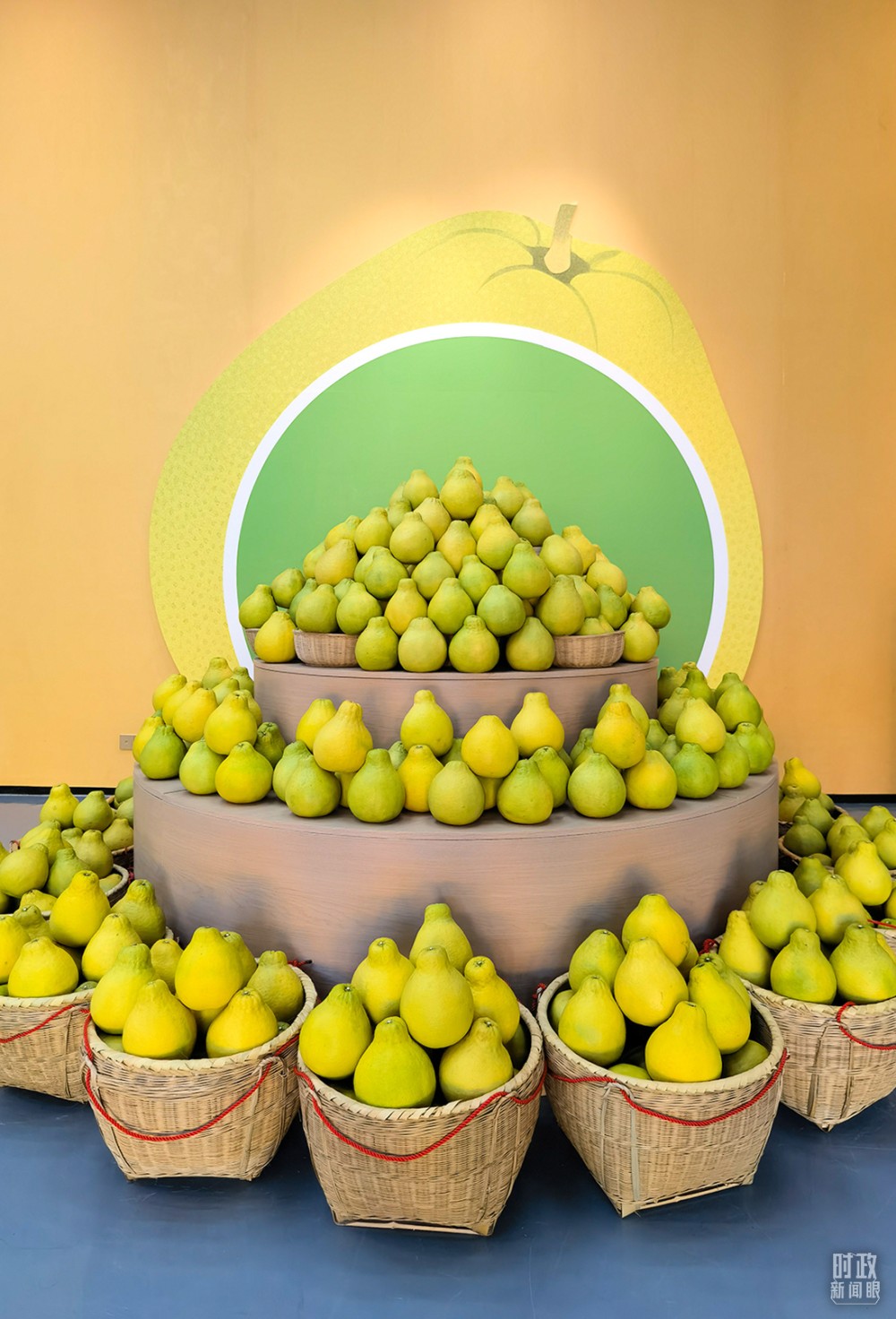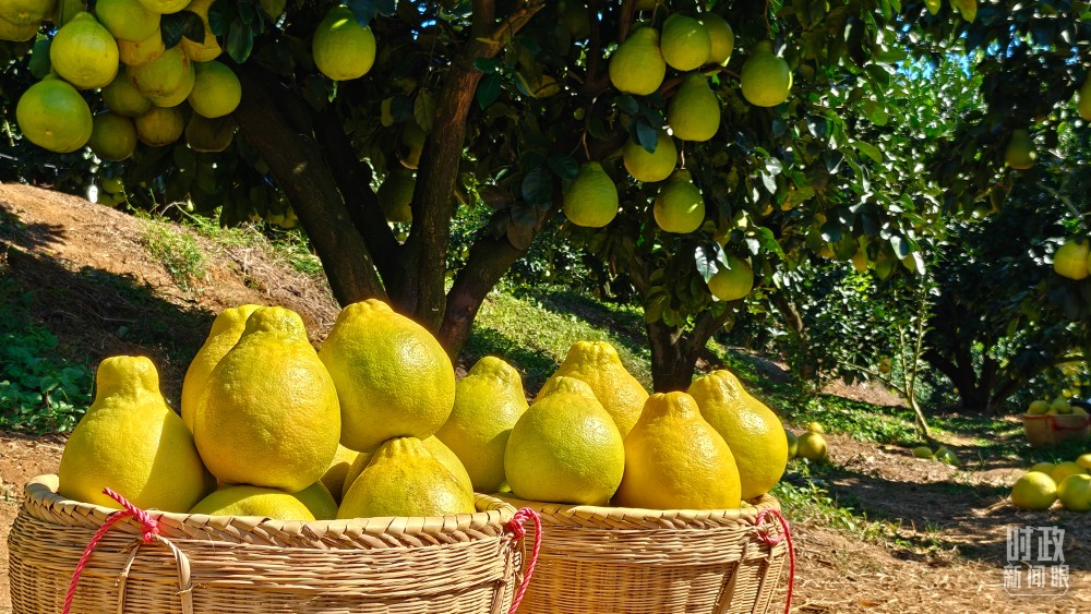 △南福金柚种植基地,柚林迎来丰收。(总台记者吴媚苗、总台央视记者鄂介甫拍摄)梅州是中国金柚之乡,“梅县金柚”2021年获国家地理标志农产品保护认证,其种植历史已有100多年。