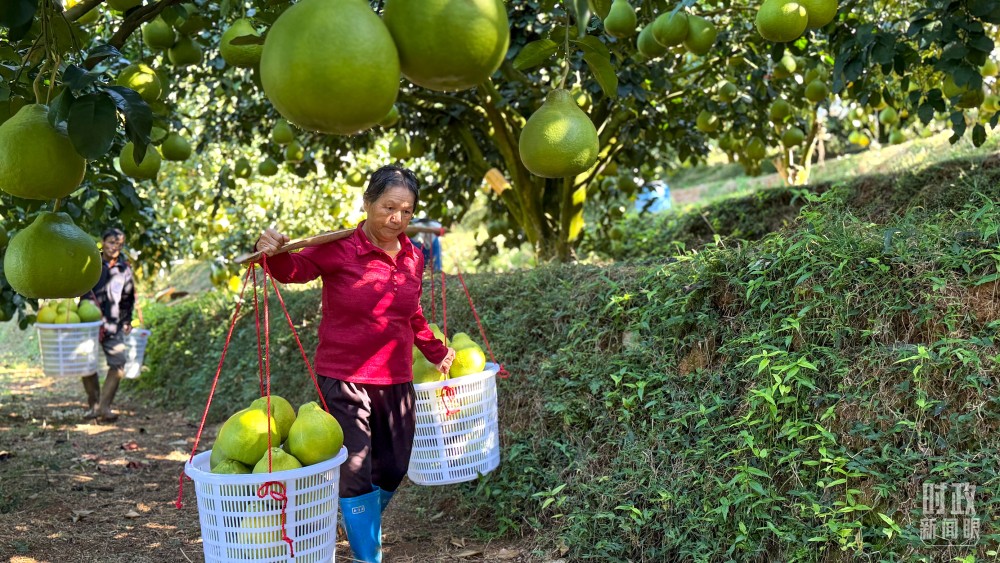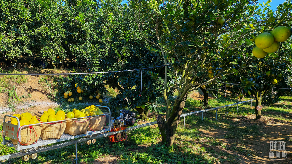 △金柚采摘运送用上了无人轨道车,可大大减轻人力负担。(总台央视记者郭鸿拍摄)如今,梅县区金柚种植面积近28万亩,柚农5万多户,依托金柚产业人均年收入1万多元,占农业人口人均年收入的40%。金柚已成为梅县农民的“摇钱树”“致富果”。