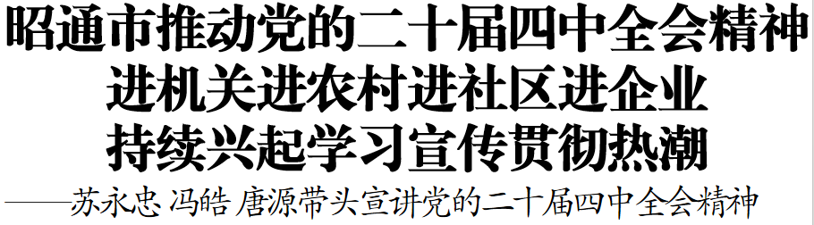 党的二十届四中全会胜利闭幕后,按照中央、省委部署要求,昭通市迅速召开市委常委会扩大会议,认真传达学习全会精神,举行市委理论学习中心组集中学习,成立由市委书记苏永忠任团长,市委副书记、市长冯皓和市委副书记、市委宣传部部长唐源任副团长的学习贯彻党的二十届四中全会精神市委宣讲团,分赴各县(市、区)、各行业领域开展宣讲。苏永忠强调,学习好、宣传好、贯彻好党的二十届四中全会精神,是当前和今后一个时期的重要政治任务。要紧紧围绕习近平总书记在党的二十届四中全会上的重要讲话精神和全会审议通过的《中共中央关于制定国民经济和社会发展第十五个五年规划的建议》(以下简称《建议》),扎实抓好学习培训、宣传宣讲、研究阐释等工作,市委常委班子要带头开展宣传宣讲,推动全会精神进机关、进农村、进社区、进学校、进企业,在全市持续兴起学习宣传贯彻热潮。