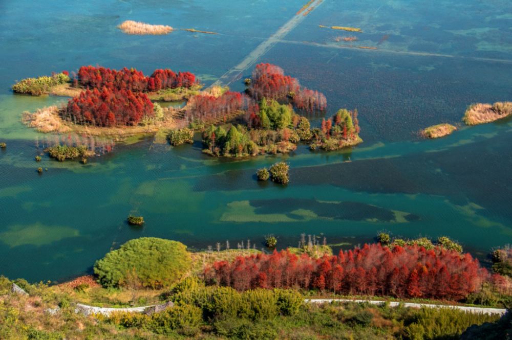 在文山壮族苗族自治州丘北县普者黑,水杉披上绯红与金黄,在青黛峰林间勾勒出初冬最温柔的色彩,层林尽染,丹青自成,仿佛天地调和了墨色,晕开浓淡相宜的冬韵。