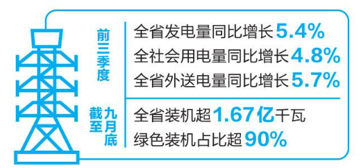 发电量、用电量、送电量持续增长,有力支撑全省经济发展。今年前三季度,全省发电量同比增长5.4%,全社会用电量2148.35亿千瓦时,同比增长4.8%,其中,一二三产用电量同比分别增长10.2%、3%、10%;全省外送电量同比增长5.7%,作为“西电东送”战略的重要省份,今年全省“西电东送”电量预计超过2100亿千瓦时,再创新高。截至9月底,全省装机超1.67亿千瓦,其中,绿色电力装机超1.5亿千瓦,绿色装机占比超90%,绿色底色更加鲜明。