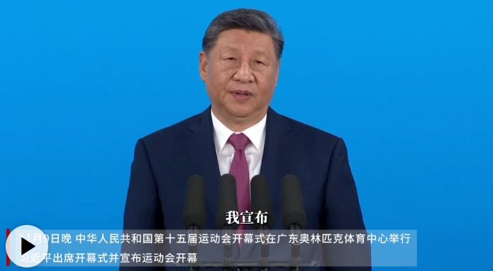 11月9日晚,中华人民共和国第十五届运动会在广东省广州市隆重开幕。中共中央总书记、国家主席、中央军委主席习近平出席开幕式并宣布运动会开幕。