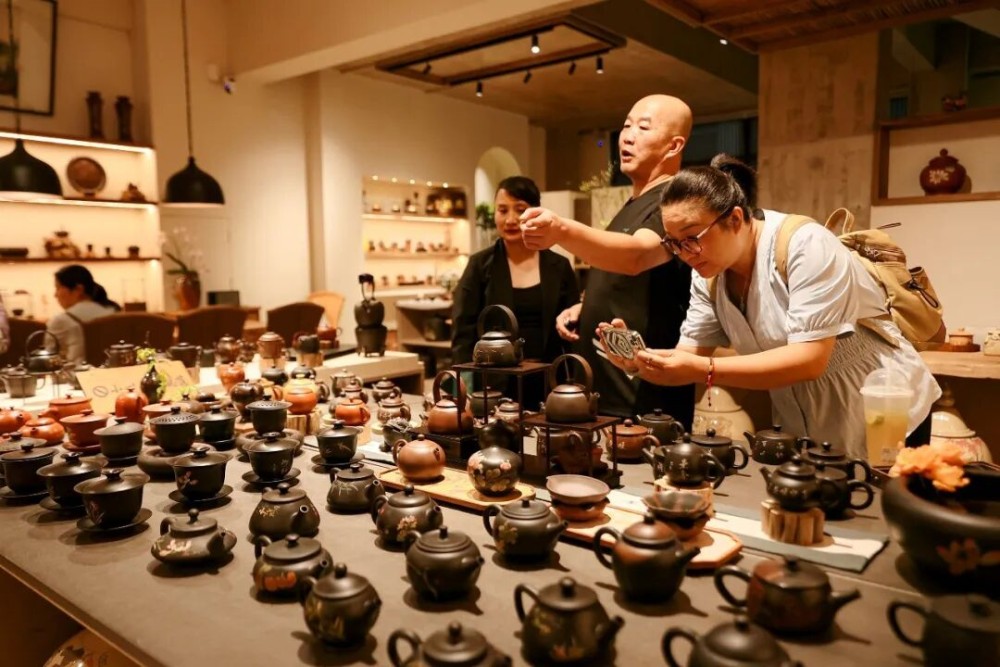游客在紫陶店内挑选紫陶茶具。胡妤雅 摄