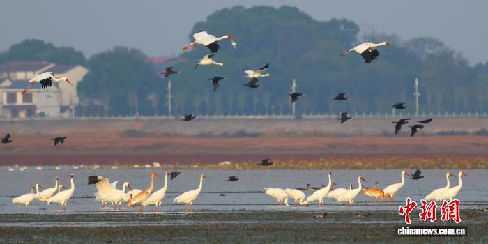 11月12日,地处鄱阳湖腹地的江西省九江市永修县吴城镇,白鹤等候鸟共舞。王小龙 摄中国中部省份江西地处“东亚—澳大利西亚”候鸟迁徙通道上,这是全球九大候鸟迁徙通道之一。