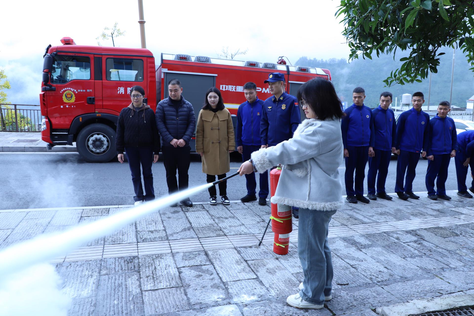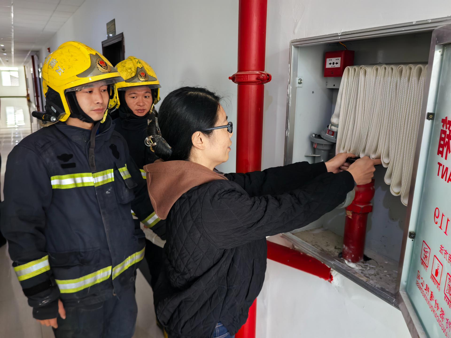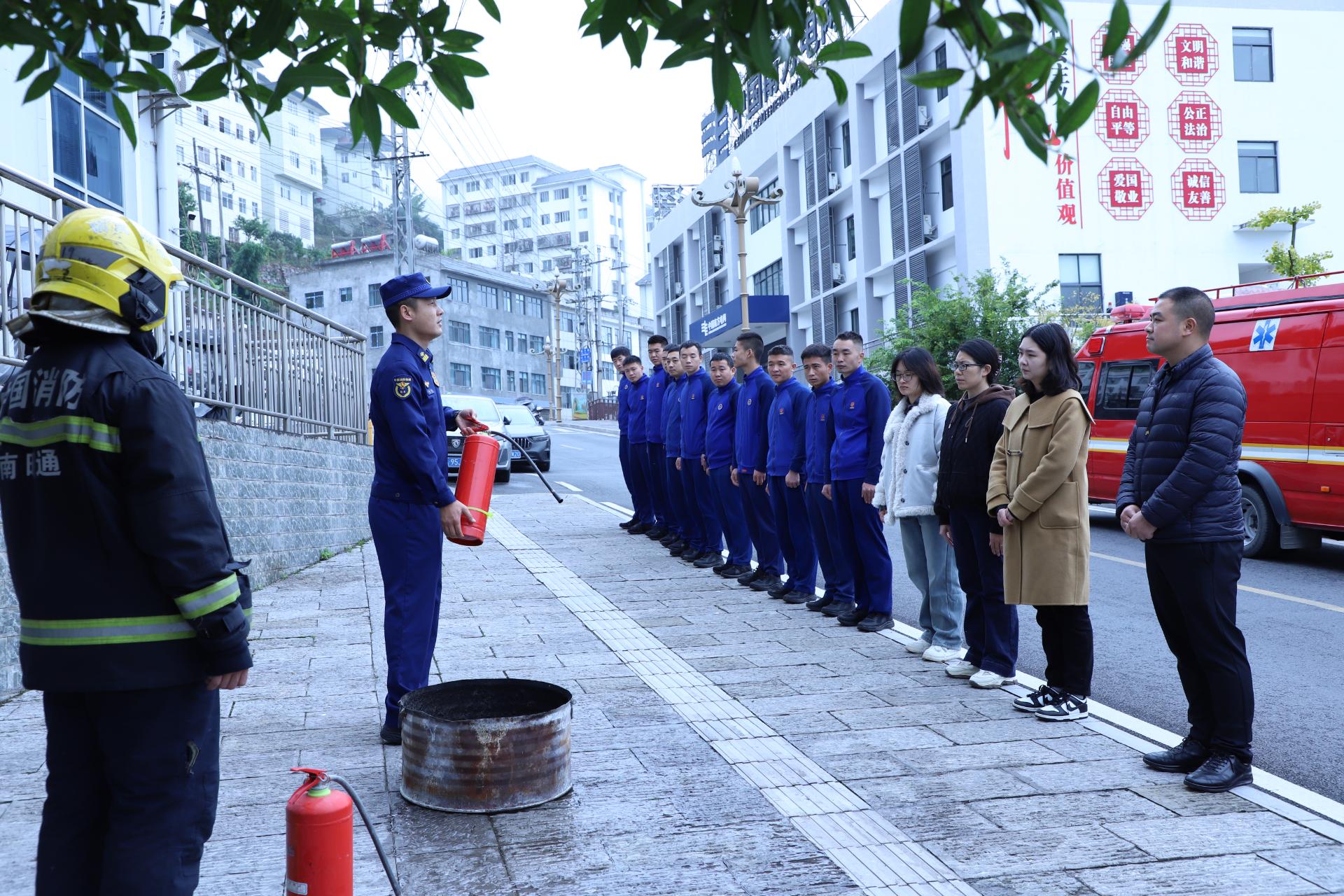 在实操实训环节,消防宣传员现场演示了消防水带连接、灭火器使用等,还进行了灭火器实操演练,并模拟了火情报警、紧急疏散、初期火灾扑救及档案应急抢运等应急处置场景。