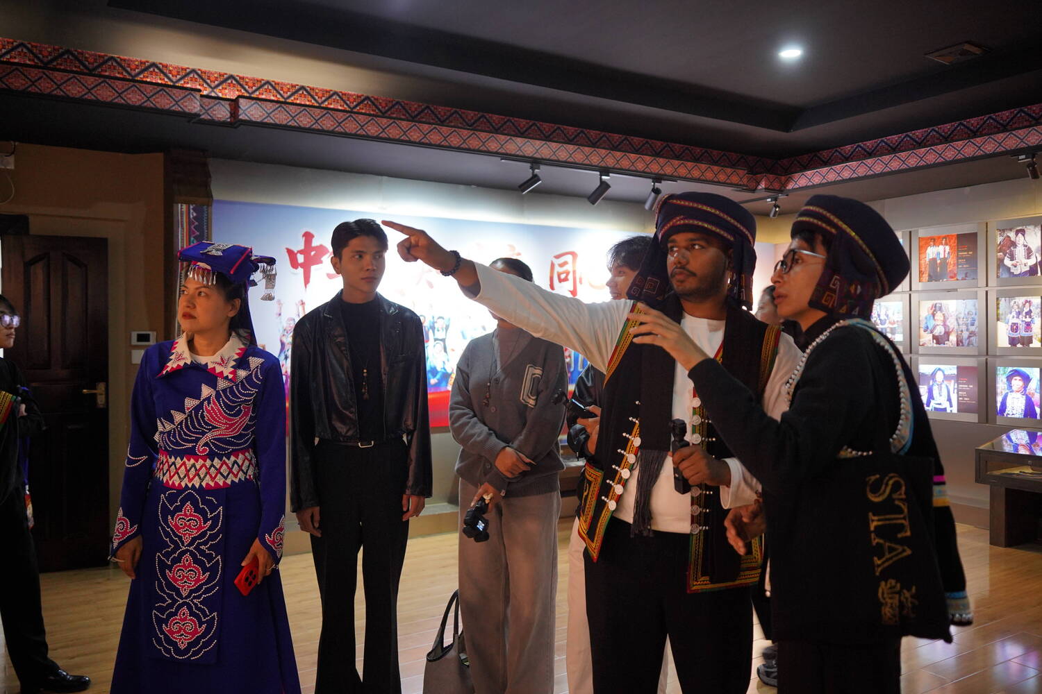 在绿春县博物馆,博主们聆听了绿春县哈尼学会会长卢志春关于哈尼族起源与发展的讲解,那些古老的传说与迁徙故事,唤起了来自老挝的博主们内心深处的文化记忆。“当我们听到《都玛简收》的传说时,我感到非常惊奇,因为它与我们琅勃拉邦的某些故事如此相似。”Jojo在交流中感慨道。“相比之下,我们的阿卡服饰样式较为单一,而这里的服饰款式多样、工艺精湛。或许有一天,中老两地的民族服饰能够相互借鉴,碰撞出新的创意火花?”他笑着说。