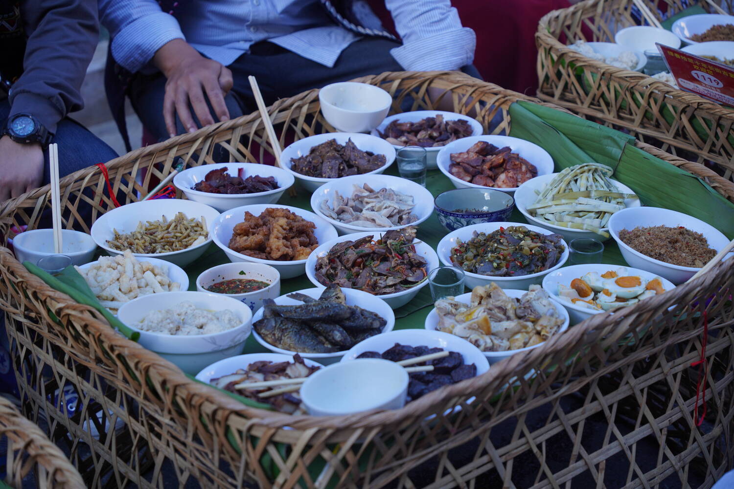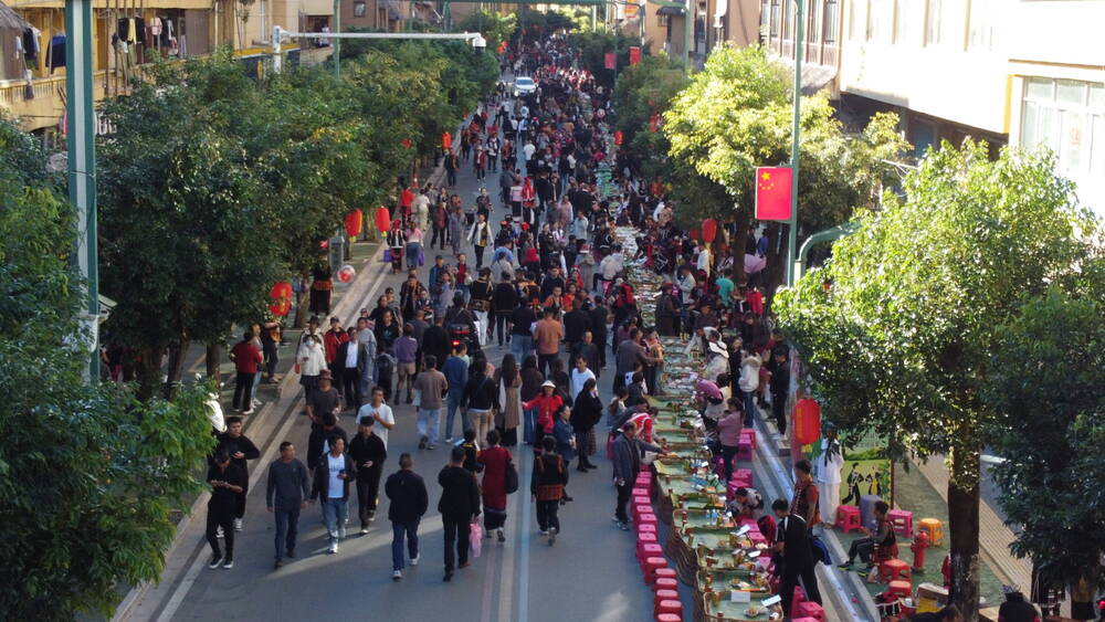 傍晚时分,绿春县城的主街道化作了欢乐的海洋。三千桌宴席构成一条望不见尽头的美食长龙。身着盛装的各族人民载歌载舞,鼓铓声、欢笑声、祝酒歌此起彼伏,这是绿春哈尼十月年的天下“最长的宴席”,源自哈尼族古老的“岁首”丰收庆典。家家户户摆出精心准备的佳肴,与邻里亲友、远道而来的客人分享丰收的喜悦。