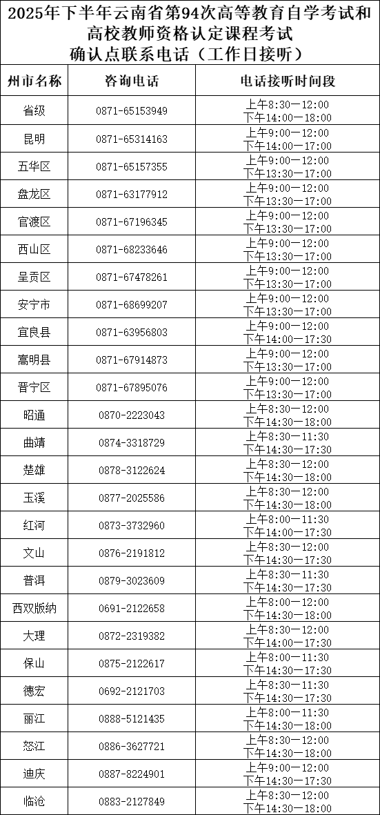 附件:2025年下半年云南省第94次高等教育自学考试和高校教师资格认定课程考试确认点联系电话