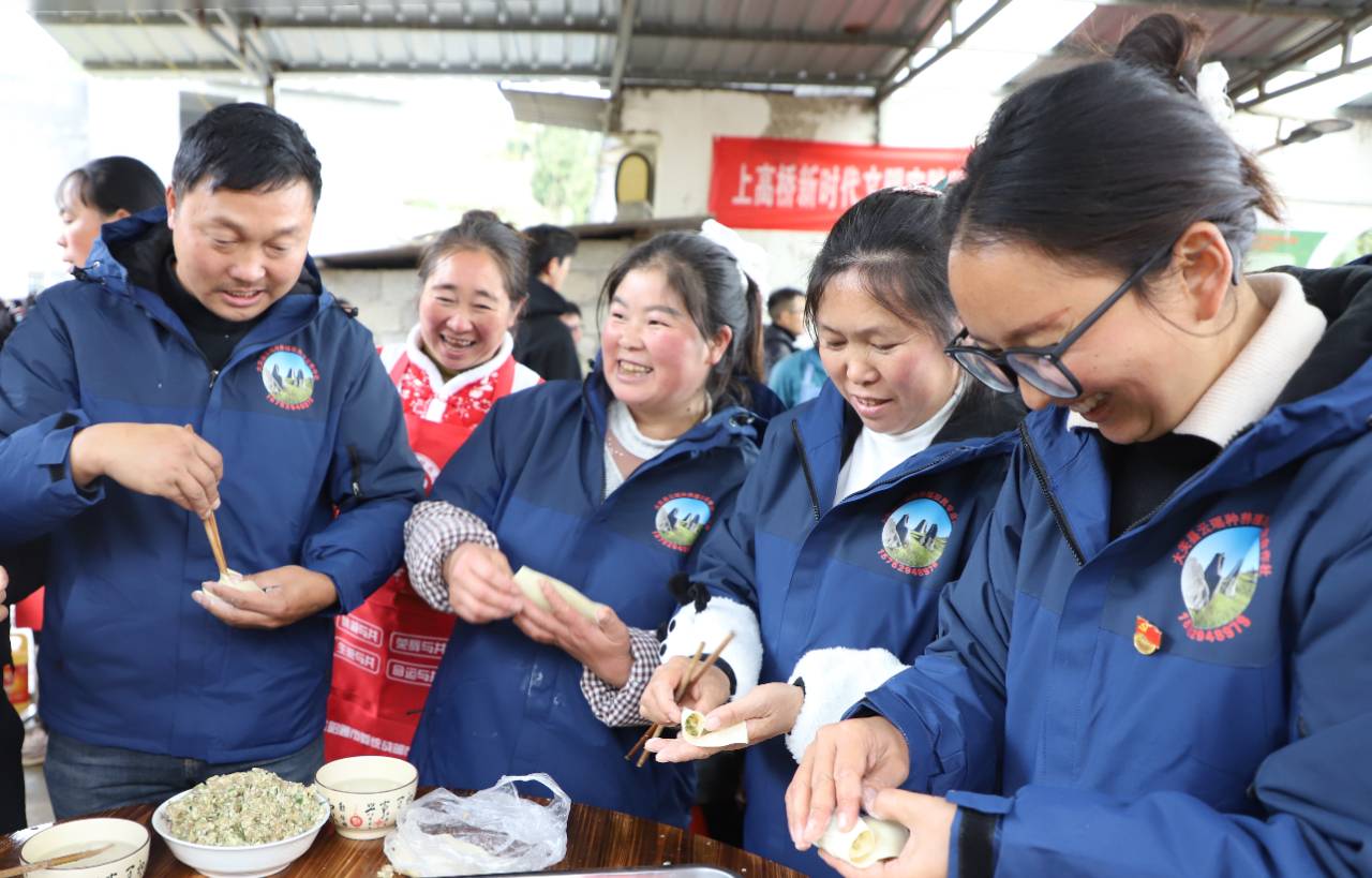 活动现场,红旗村活动中心院坝内一派忙碌景象。村“两委”、驻村队员、活动赞助方组成的志愿者队伍早早来到现场,大家分工协作,备菜、调馅、包饺子,不一会儿,一个个饱满的饺子便摆满了餐盘。