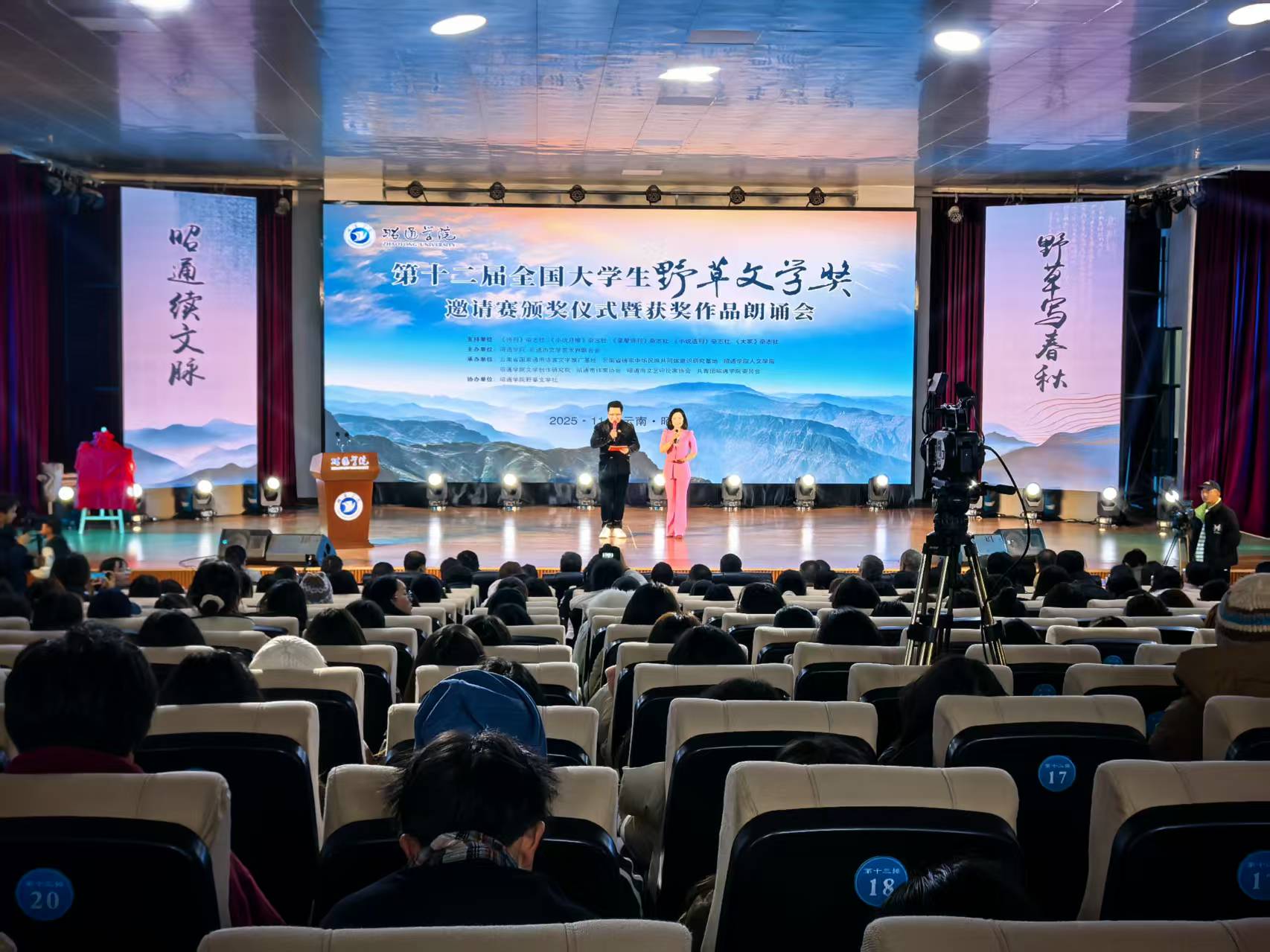 11月18日,第十二届(2025)全国大学生“野草文学奖”邀请赛颁奖典礼暨获奖作品朗诵会在昭通学院教师教育培训中心报告厅如期举行。本届大赛历经匿名初审、复审和终审,最终评选出诗歌、散文、小说三大组别的获奖作品。活动现场通过深情朗诵,让文字的力量直抵人心,展现了当代大学生蓬勃的文学创造力。