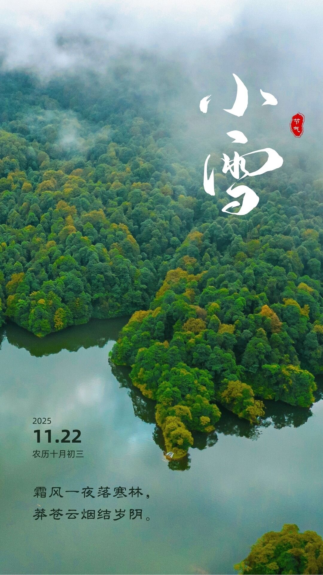 青山隐隐,偶见人烟,云雾轻笼江面,山坳间的村落屋舍炊烟袅袅,散发着人间烟火的暖意。铜锣坝的原始森林层林半染秋黄、半留翠色,林间的仙女湖如镜,将冬日的素净悉数纳入。枯木桩上,赤灵芝红云般涌现,在冷寒风中,绽放着蓬勃生机。漫山竹林经细雨润泽,地下笋根正悄然蓄力,静待春雷唤醒。暮色渐渐浸染邵女坪,金沙江上波光潋滟跃动,天地沉浸于一片温柔的余晖里,静谧地迎候着小雪节气的来临。冬日的水富,在湿润的空气里继续书写着生命的绵长与丰饶。