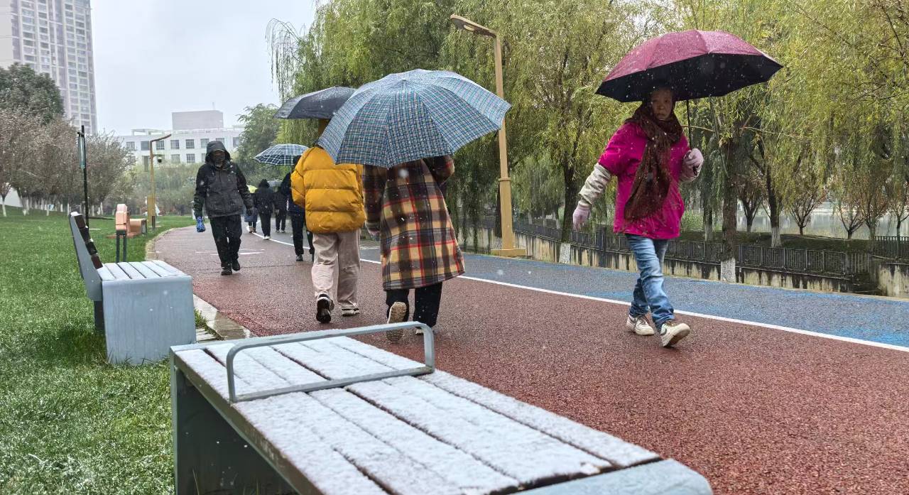 公园里渐渐热闹起来,却不显喧嚣。游人三三两两,有的裹着厚实的棉袄,戴着毛茸茸的帽子,有的撑着色彩斑斓的雨伞,脚步轻轻,生怕打破这冬日的静谧。他们举着手机,对着草上的雪、阶前的树、远处覆雪的房舍,不停拍摄,总想将这转瞬即逝的美景定格。骑行者与晨跑者则行色匆匆,单薄的运动服挡不住寒风,更挡不住前行的热忱,身影一闪而过,只留下一串急促的脚步声,在雪地里漾开涟漪,彰显着生命最本真的活力。