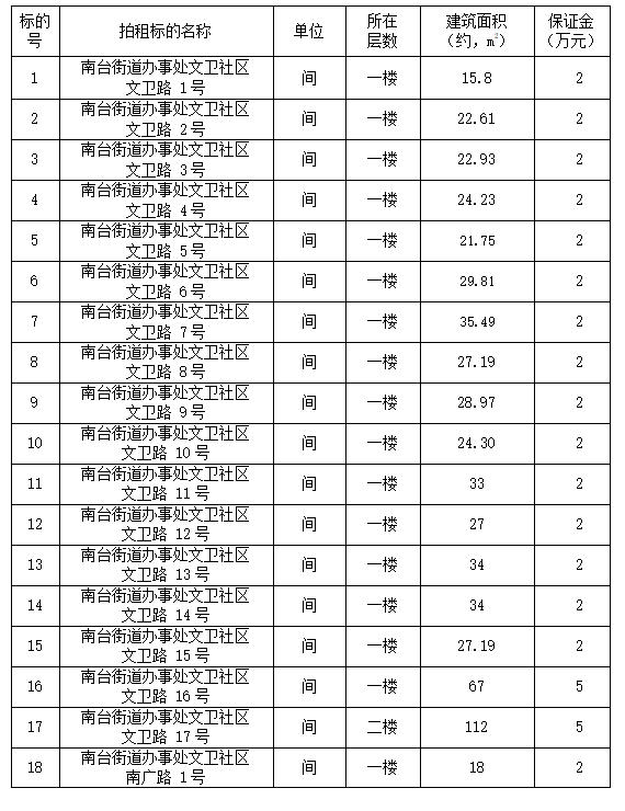 1、交纳一份保证金只能成交一个标的,欲竞租多个标的的,保证金以此类推(注:各标的对应的竞租保证金如表所示)。若竞租人违约,竞租保证金作为违约金不予退还。