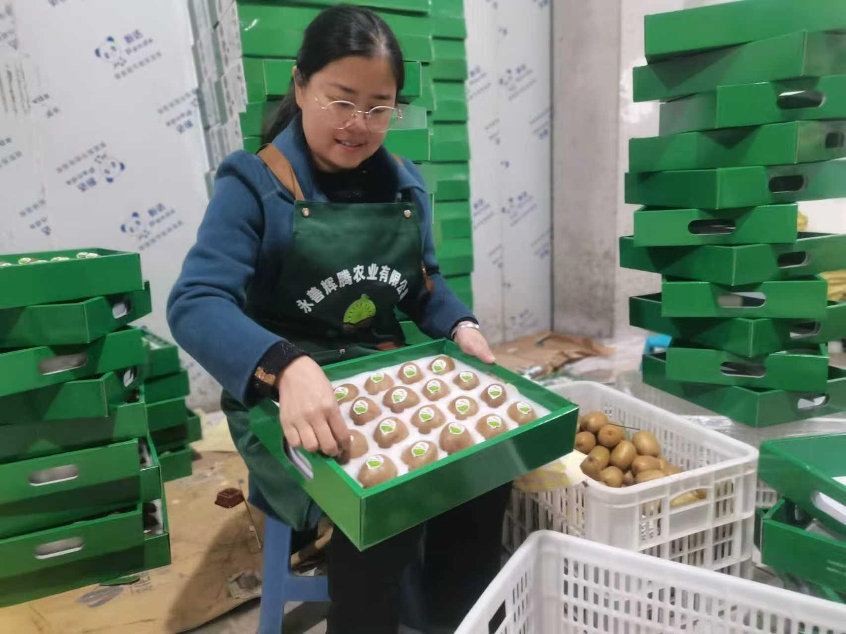 分拣区内,一条自动化分拣流水线高速运转着。分拣机依照果径大小自动筛选,车间负责人张伦在一旁指导,装箱的女工们则娴熟地套膜、贴标,一箱箱打包好的猕猴桃被码放得整整齐齐,静待装运出库。