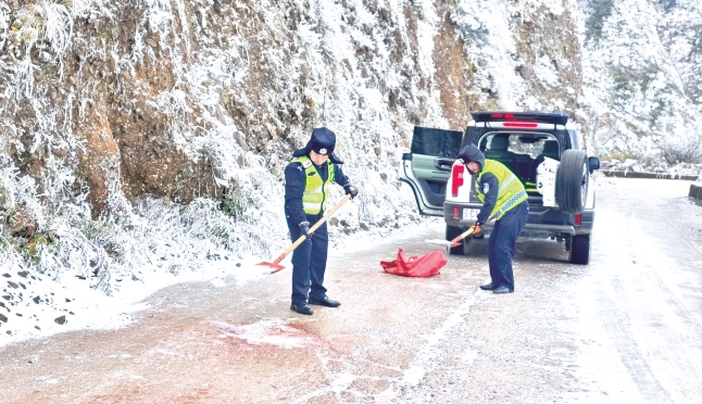 受强冷空气影响,近期巧家县迎来降雪天气,致使东坪镇辖区内部分路段出现不同程度凝冻情况,给群众出行带来较大安全隐患。东坪派出所民辅警迅速出动,以“保畅通、护平安”为首要任务,全力投入融冰除雪工作。在东坪镇哨口子等重点结冰路段,民辅警迅速开展融冰除雪作业,他们手持铁锹,将融雪剂均匀抛撒在结冰路面,加速冰雪融化。同时,东坪派出所采取“定点执勤+动态巡逻”的方式,全面加强路面管控,及时消除路面隐患,疏导滞留车辆,确保主干道安全畅通。