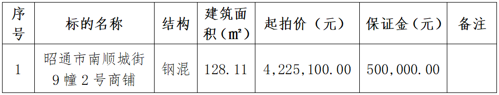 受中国建设银行股份有限公司昭通市分行委托,我公司将于2025年12月24日10时起至2025年12月25日10时止(延时除外)在淘宝网阿里拍卖资产处置平台(网址:http://zc.paimai.taobao.com)对昭通市南顺城街9幢2号商铺以网络竞价的方式进行公开拍卖,现将有关事宜公告如下:
