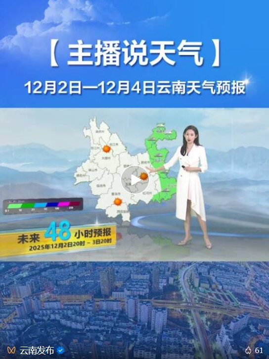 1、12月2日至3日、7日云南中东部降温雨雪天气,需防范其对农业、交通、电力、公众健康等的不利影响,做好城乡用电用火安全。