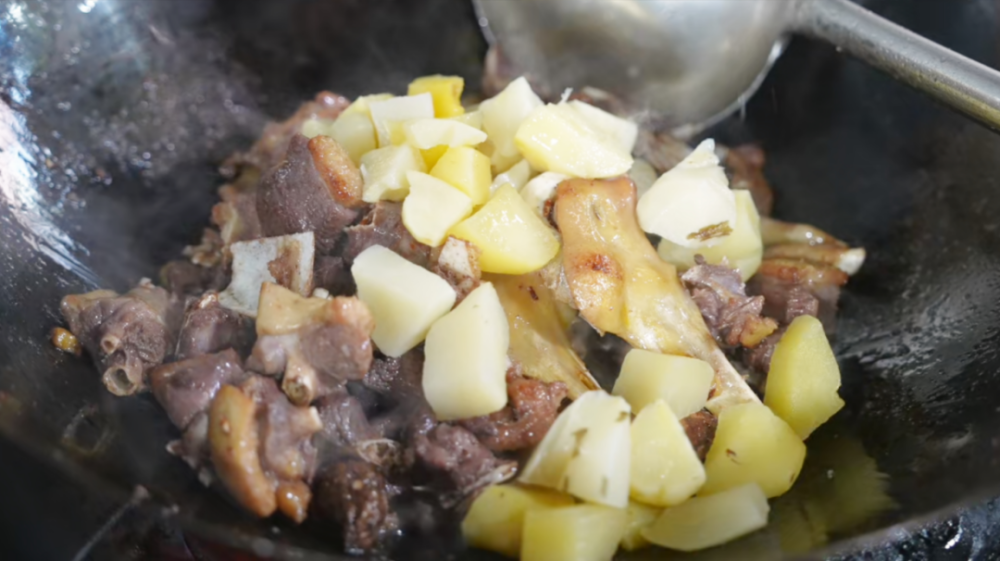 把新鲜采收的滇黄精洗干净,切成厚片,搭配本地散养的大鹅一起炖煮。大鹅肉质紧实,脂肪少,和黄精一起放入锅中,加几片生姜,用小火慢炖两个小时左右。随着汤汁慢慢变浓,颜色转为琥珀色,鹅肉变得酥烂,黄精也软糯微甜。整道菜不用加过多调料,汤味清润不腻,回口还有一丝自然甘甜。