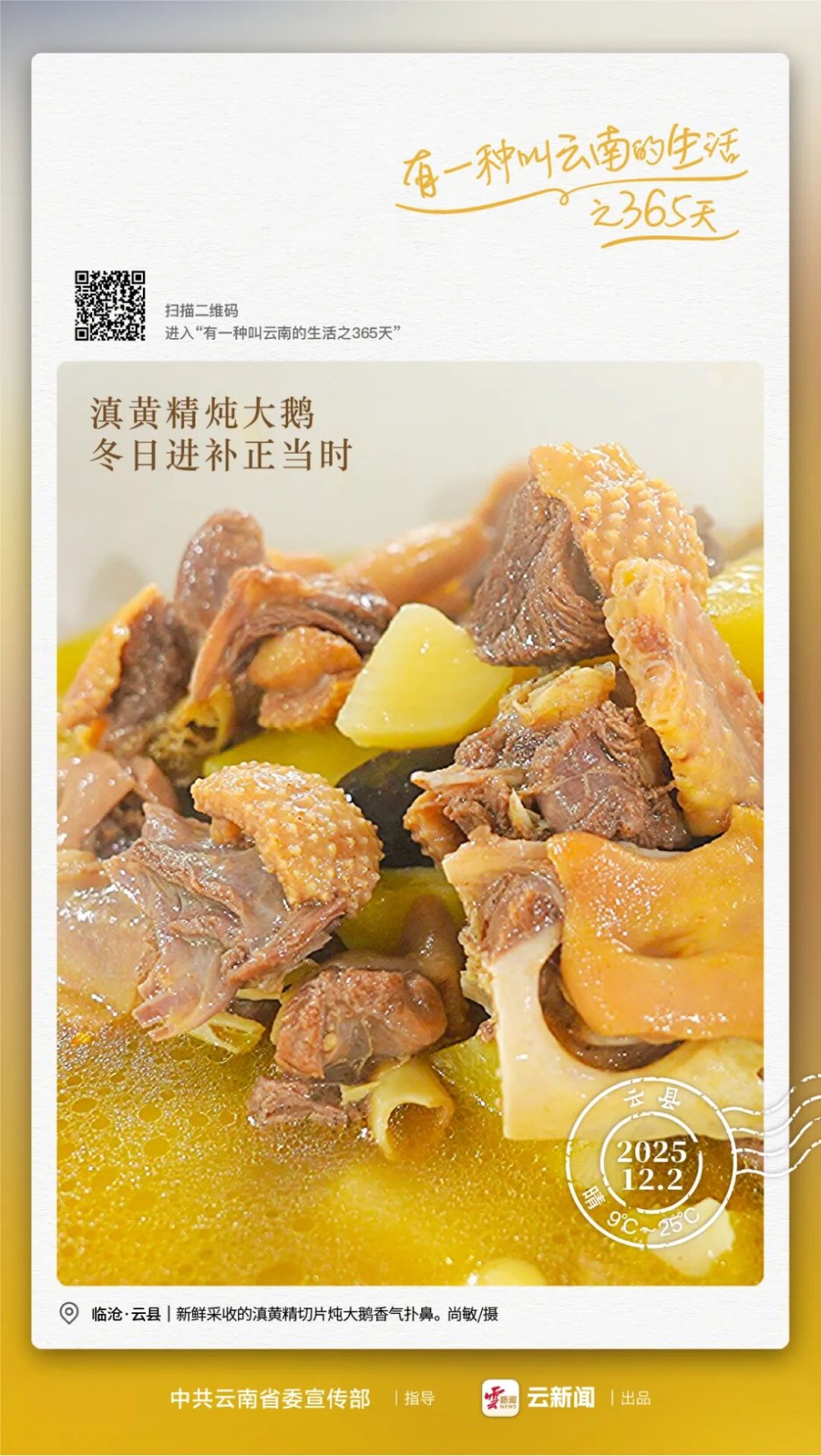 这锅炖菜,藏着云县的好水土,补气血又暖身子,正是“有一种叫云南的生活”该有的滋味——取自自然,暖在日常。天冷的时候,一家人围坐在一起,喝一碗热腾腾的滇黄精鹅汤,既舒服又踏实,把冬天的寒意一点点驱散。