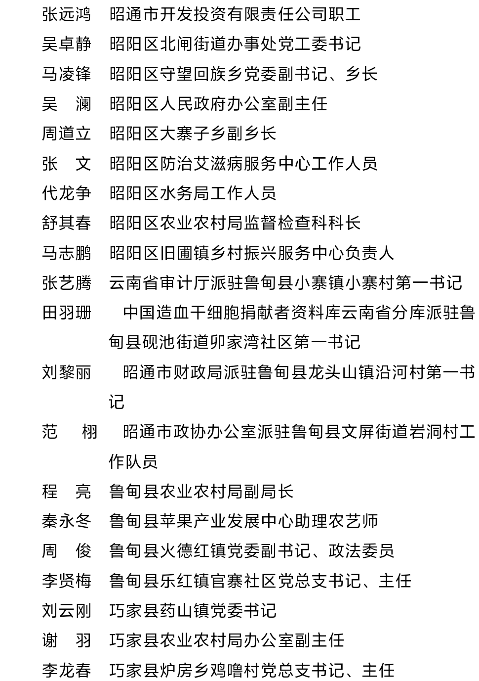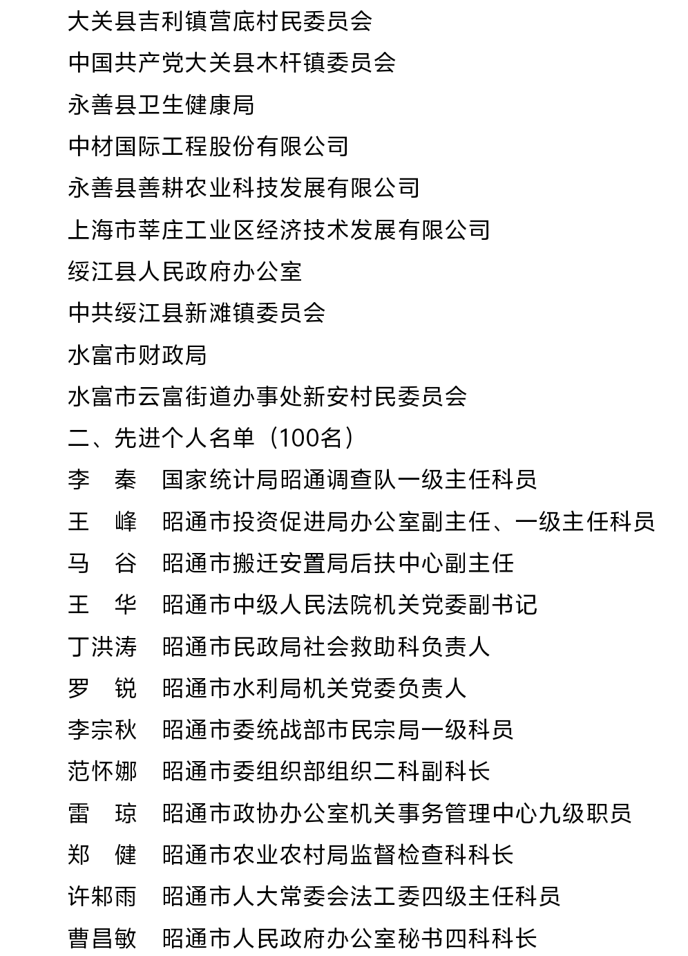 根据《中共昭通市委办公室 昭通市人民政府办公室关于做好昭通市巩固拓展脱贫攻坚成果同乡村振兴有效衔接工作先进集体和先进个人评比表彰工作的通知》要求,按照评比范围、条件和程序,坚持公开、公平、公正的原则,经自下而上、逐级审核推荐,并经昭通市巩固拓展脱贫攻坚成果同乡村振兴有效衔接工作先进集体和先进个人评比表彰工作专班复审,现将昭通市巩固拓展脱贫攻坚成果同乡村振兴有效衔接工作先进集体和先进个人拟表彰对象名单予以公示。