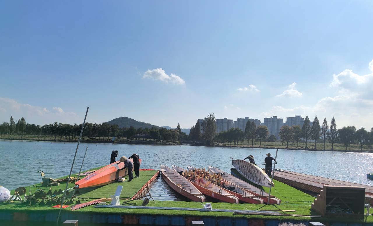 鉴湖边,船工正在修补龙舟。 王文其 摄此时,书店的对岸,戴着草帽的船工们正细致地修补着龙舟,那个周末正要举办龙舟赛,村民们始终坚守着“竹韵工坊”“渔歌龙舟”等非遗项目,让历史不断延续。