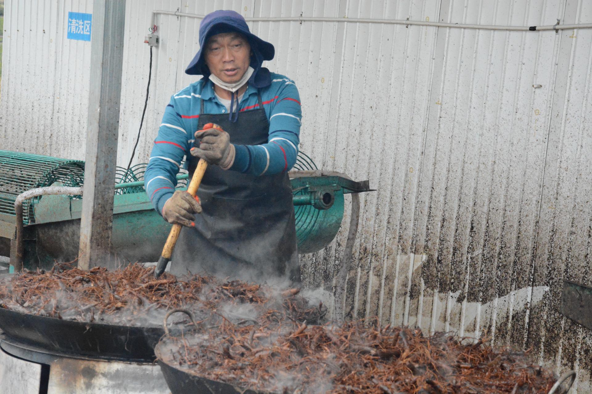 另一角,炉火正旺。工人孟正顺翻动着锅中的草乌,旁边的搭档手持水枪和铲子仔细清洗。“草乌有毒,要先煮40分钟,再用机器去皮,然后晾晒。”孟正顺说着又往灶里添了几块木柴,“我和媳妇都在这儿干活,每天有专人记录工时,两人加起来已经有几十个工时了。”