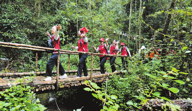 沿着蜿蜒山路上行至天堂山,沿江村则是另一番热闹景象。这里凭借94.6%的森林覆盖率,成功打造出“自在漭水、徒步天堂山”的旅游品牌。
