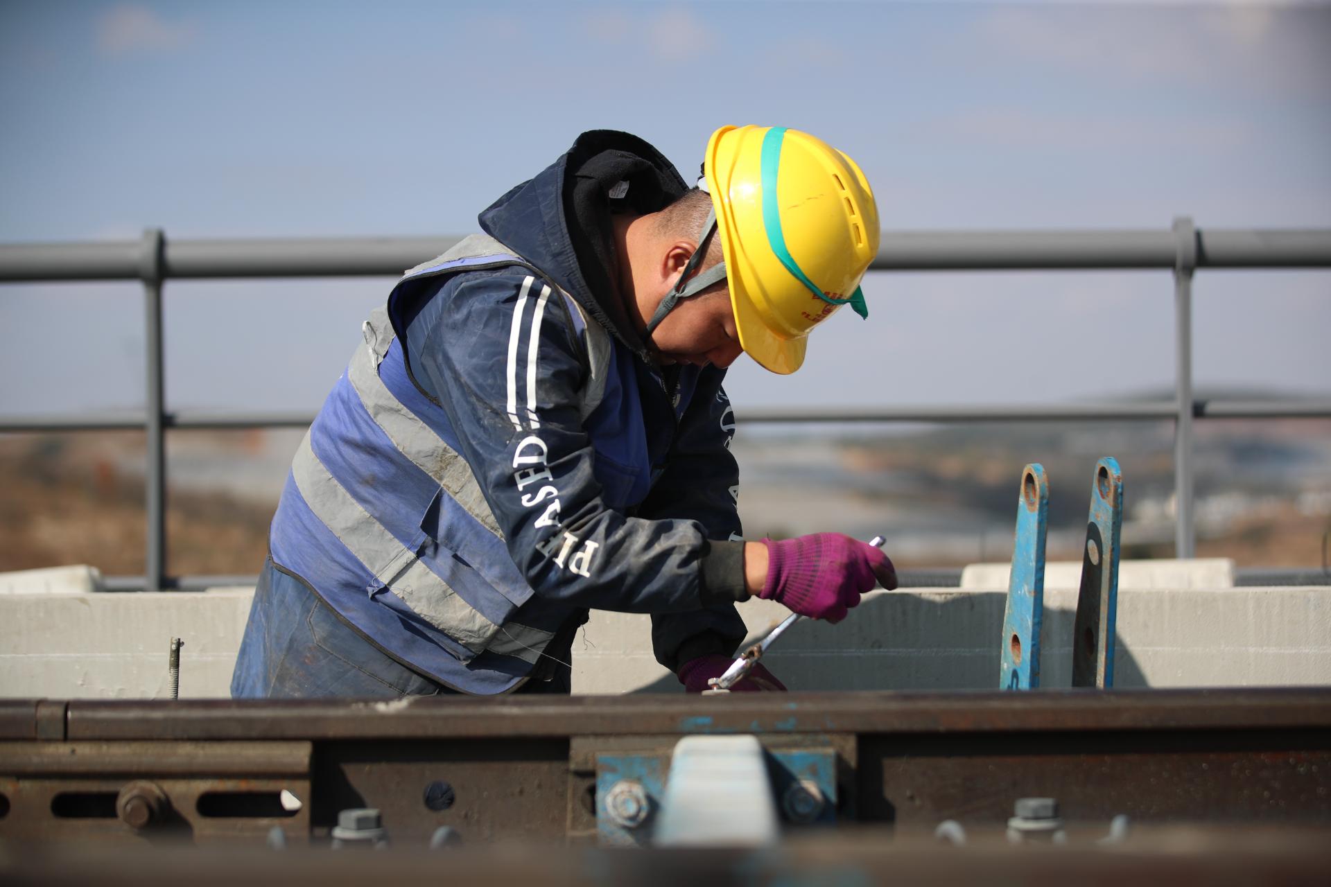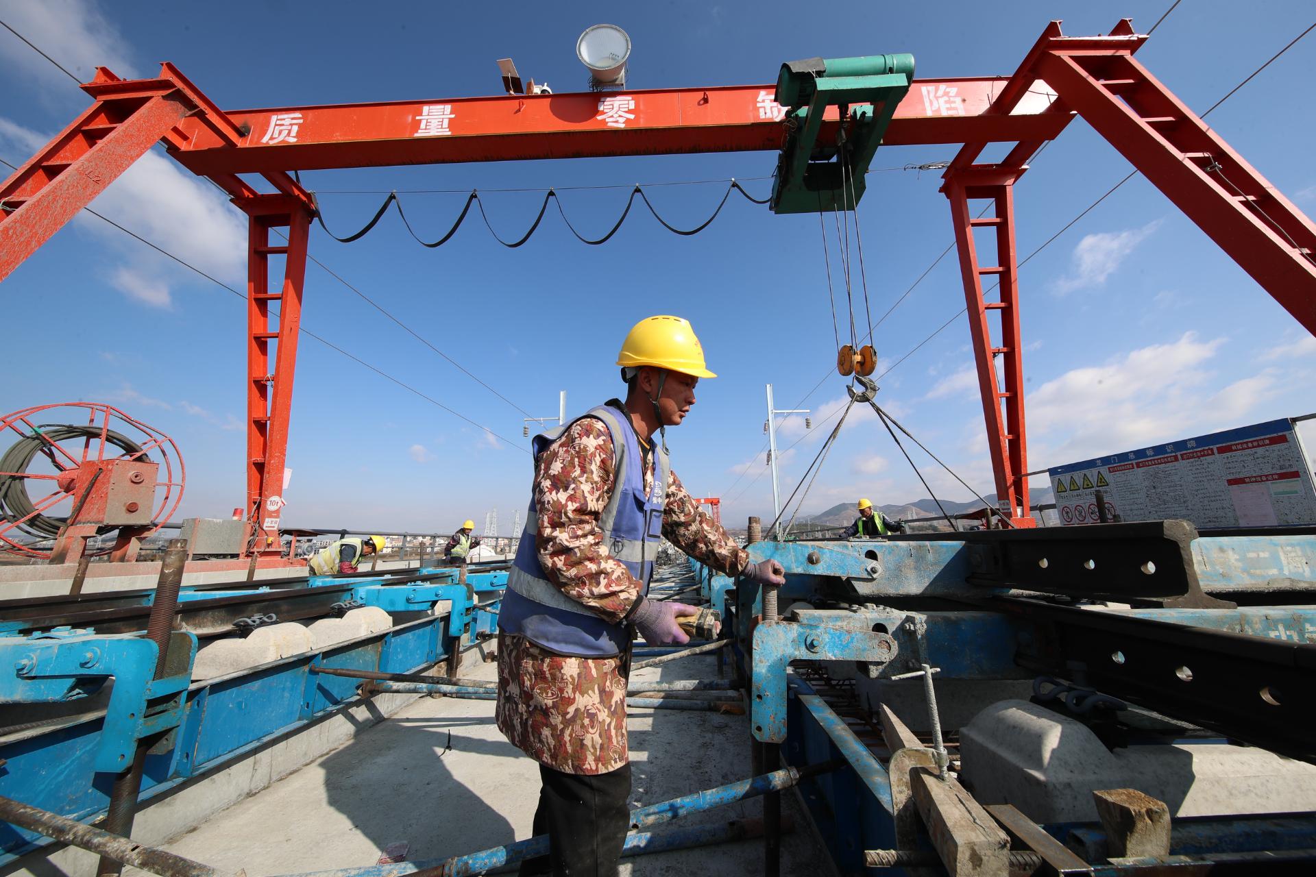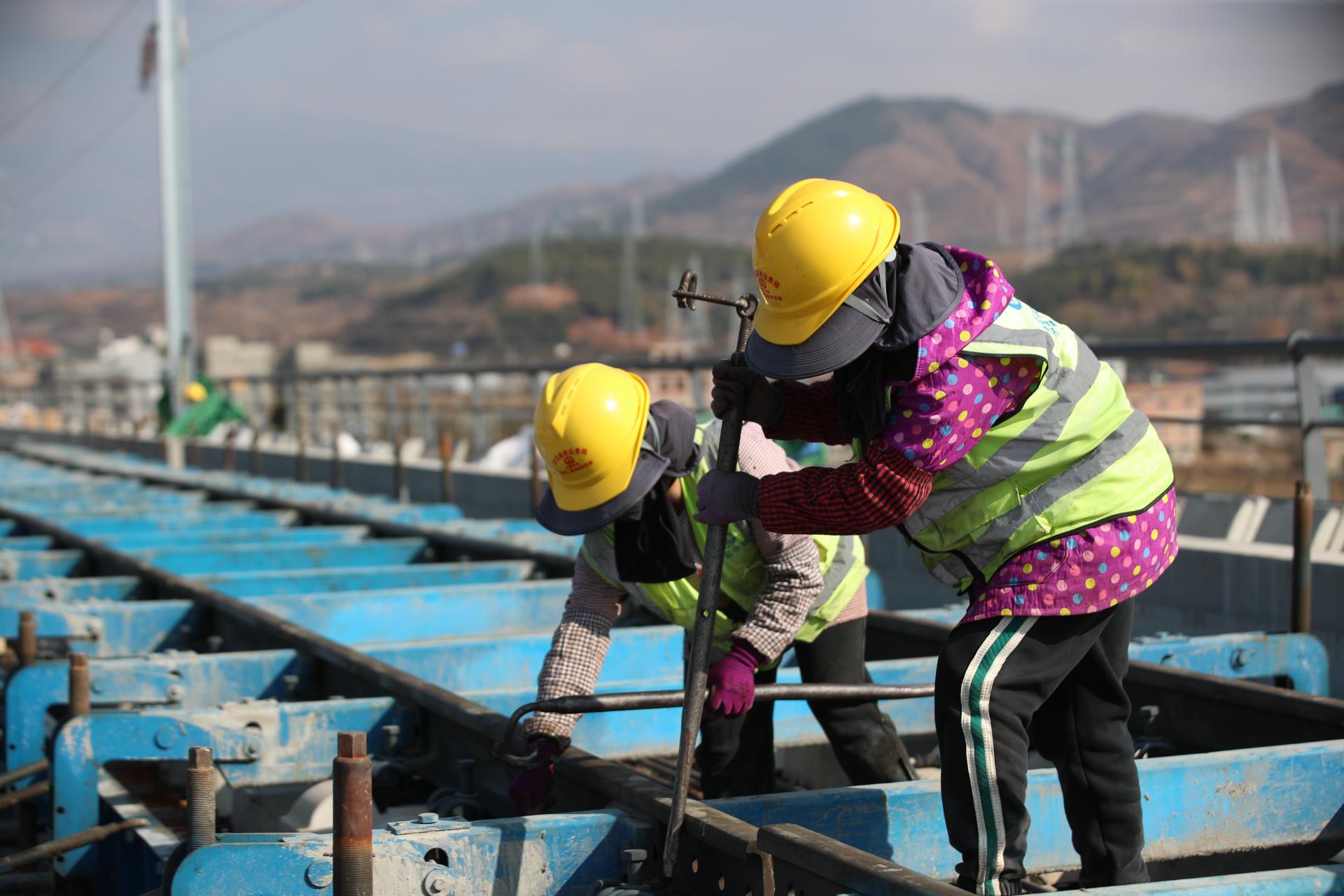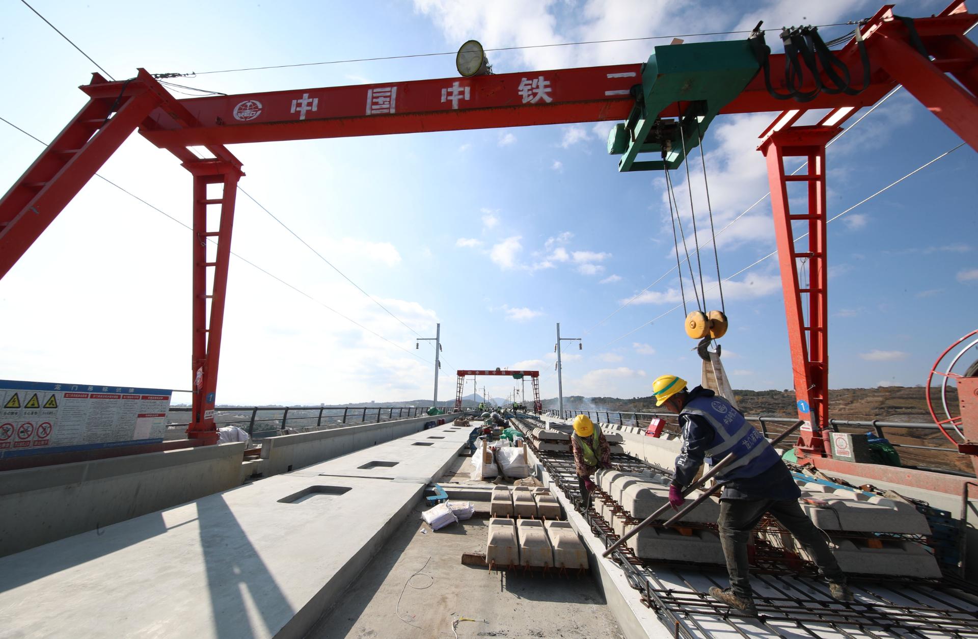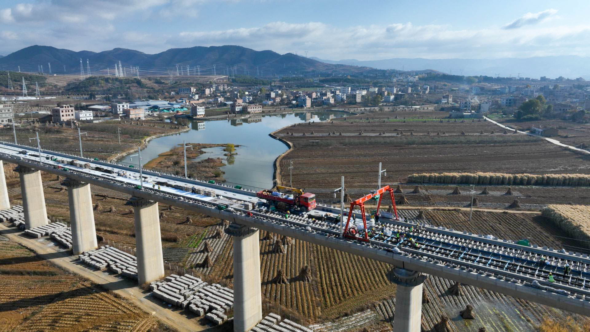 2025年12月7日,云南省昭通市昭阳区守望回族乡,中铁二局的工人在渝昆高铁卡子村特大桥进行无砟道床作业。