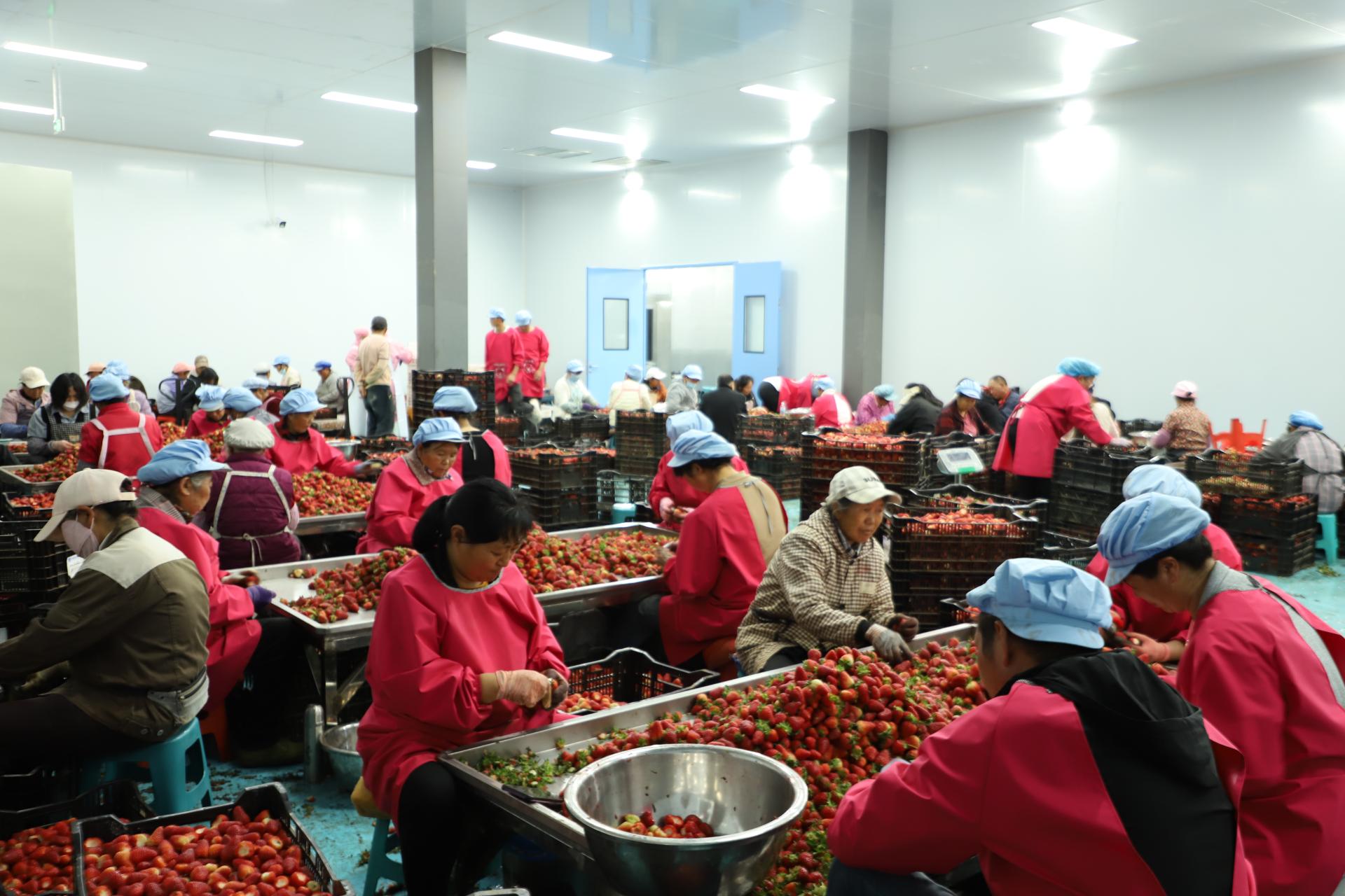 马树镇党委通过推行“党支部+科研机构+企业+农户”的四方联动模式,依托高海拔冷凉气候,精心培育错季草莓、优质马铃薯等特色产业,破解山地种植效益低的难题;组织党员干部主动对接科研机构改良草莓品种、协调资金建设草莓冻干厂,全程跟踪并服务产业发展。冬日的马树镇草莓基地里,村民们正忙着采摘、分拣、装箱,2.5万亩草莓园铺就了一条“红色致富路”。依托东西部协作资金建成的冻干厂,年加工鲜草莓3000吨,带动农户年增收2300万元,创造了1.25万个就业岗位,年务工收入超3亿元。
