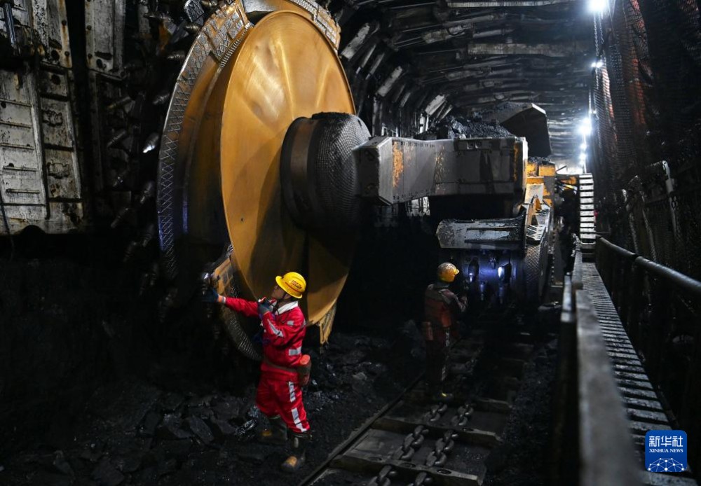 工作人员在陕西陕煤曹家滩矿业有限公司10米超大采高智能综采工作面对采煤机进行检修(2024年2月29日摄)。新华社记者 邹竞一 摄