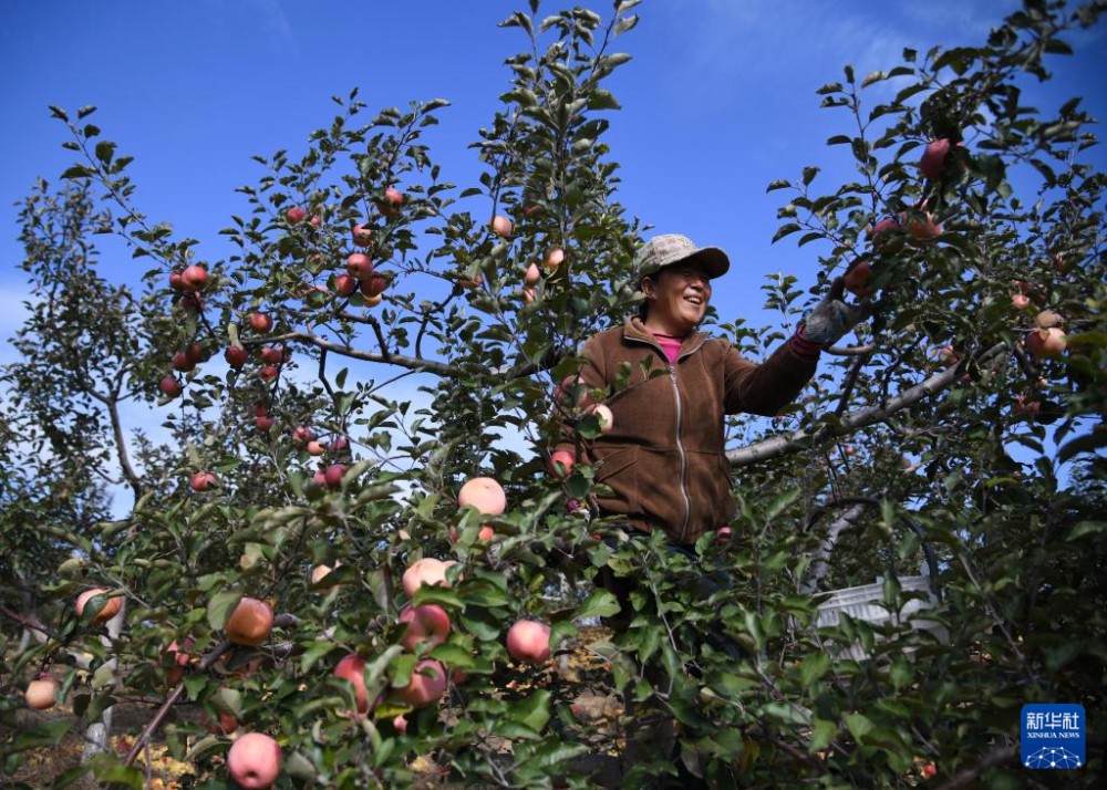 果农在陕西省榆林市横山区赵石畔镇一处果园采收苹果(2025年11月4日摄)。新华社记者 张博文 摄