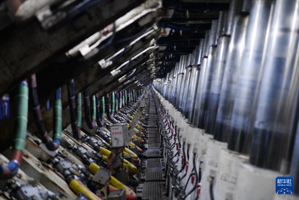 工作人员在陕西陕煤曹家滩矿业有限公司全自动液压支架支撑的采煤工作面巡检(2024年2月29日摄)。新华社记者 邹竞一 摄