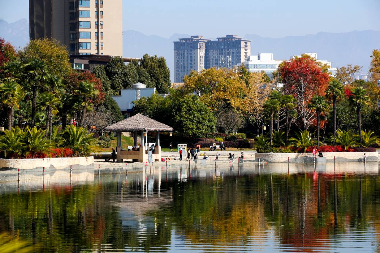 除了绚烂的彩叶,省耕国学文化公园的湖景也为冬日增加了不少暖意。湖水澄澈见底,倒映着岸边的层林尽染,天空的湛蓝与云朵的洁白,构成了一幅“水天一色、彩林映湖”的流动画卷。偶有水鸟掠过湖面,激起阵阵涟漪,虽短暂打破了湖面的宁静,却为公园景致平添了几分灵动。岸边的长椅上,不时有市民小坐休憩,或闲谈家常,或静静欣赏景色,享受着这份难得的惬意与闲适。