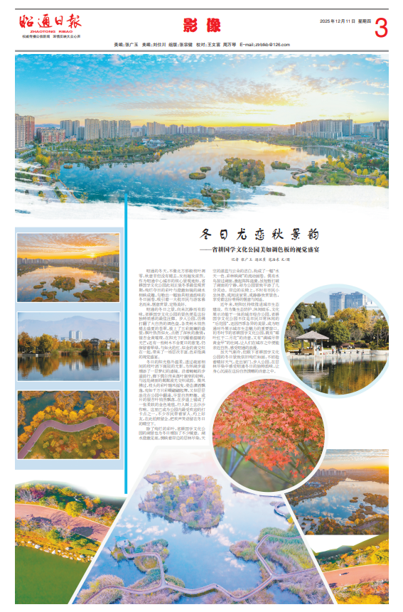 近年来,昭阳区持续推进城市生态建设。作为集生态防护、休闲娱乐、文化展示功能于一体的城市综合公园,省耕国学文化公园不仅是市民日常休闲的“后花园”,还因四季各异的美景,成为昭通对外展示城市生态魅力的重要窗口。初冬时节的省耕国学文化公园,既有“霜叶红于二月花”的诗意,又有“满城尽带黄金甲”的壮阔,让人们在城市之中便能亲近自然、感受昭通的浪漫。