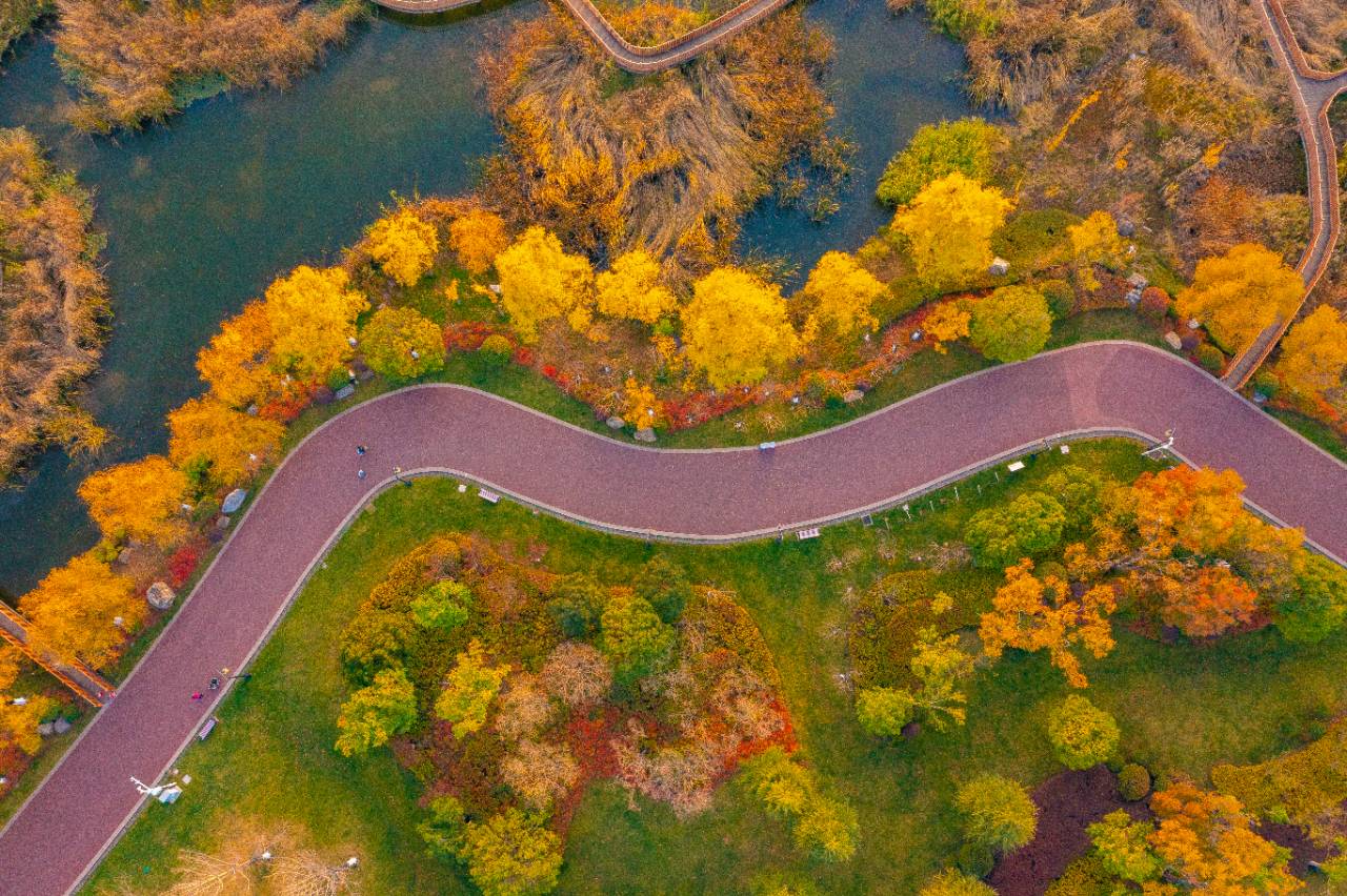 冬日的阳光格外温柔,透过疏密相间的枝叶洒下斑驳的光影,为环湖步道增添了一层梦幻的滤镜。沿着蜿蜒的步道前行,脚下偶尔传来落叶窸窣的轻响,与远处湖面的粼粼波光交织成韵。微风拂过,枝头的彩叶随风摇曳,姿态潇洒飘逸,宛如千万只彩蝶翩翩起舞,又似层层浪花在公园中翻涌,尽显自然野趣。成片的银杏叶悄然飘落,在步道上铺成了一张柔软的金色地毯,行人踩上去沙沙作响。这里已成为公园内最受欢迎的打卡点之一,不少市民带着家人、约上好友,在此拍照留念,把欢声笑语留在冬日的晴空下。