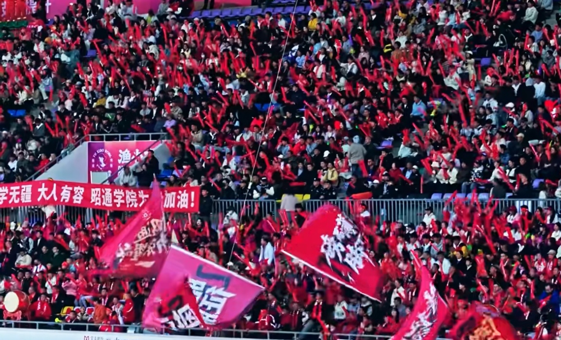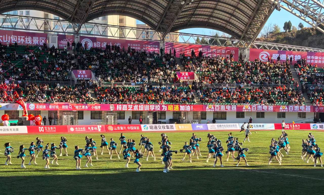 精心组织文艺编排,确保首场给观众留下深刻印象,打造一场沉浸式视听盛宴。按照 “开场15分钟+中场10分钟”的表演架构,精选优质节目组合呈现。开场环节由专业院团与昭通职业学院艺术团队联袂献艺,大型情景舞蹈《鼓韵昭阳・鹤舞长空》率先登场,以昭通黑颈鹤为创作核心,通过灵动舞姿展现人与自然和谐共生的美好图景;特邀云南流量顶流蹦山咔拉咔(云南Bigbang)压轴登场,演唱《BANG BANG BANG》《缨蔓LOVE》两大热门曲目,瞬间引爆现场氛围。中场时段,拉丁舞《青春逐梦・舞动滇联》活力上演,用动感舞步传递青春朝气。百人啦啦操《舞动滇超》精彩亮相,整齐划一的动作、昂扬向上的气势,为赛场注入满满活力。赛前同步安排舞龙舞狮表演及50名小朋友武术暖场,多元节目层层递进,让入场观众情绪快速升温,整场文艺展演获得市内外现场观众热烈掌声与广泛好评。