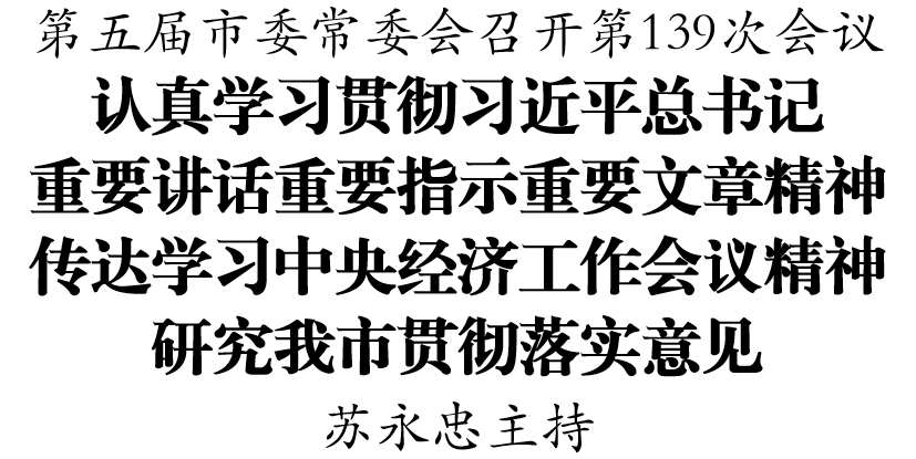 12月12日,第五届市委常委会召开第139次会议。12月12日,第五届市委常委会召开第139次会议,认真学习贯彻习近平总书记近期重要讲话重要指示重要文章精神,传达学习中央经济工作会议精神,提出我市贯彻意见;研究巡视整改、党校(行政学院)等工作。