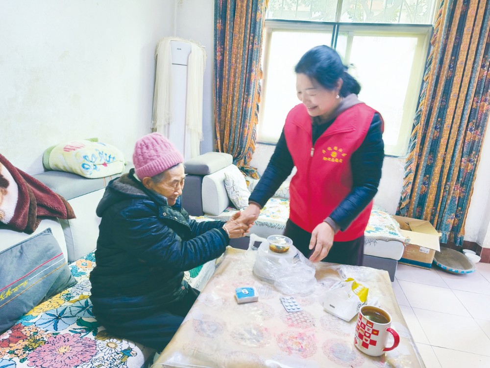 89岁的丧偶老人黄婆婆,子女都忙于工作,由72岁的志愿者赵阿姨和42岁的志愿者杨姐姐每天轮流上门,帮助买菜、打扫、测血压等,陪老人聊天。