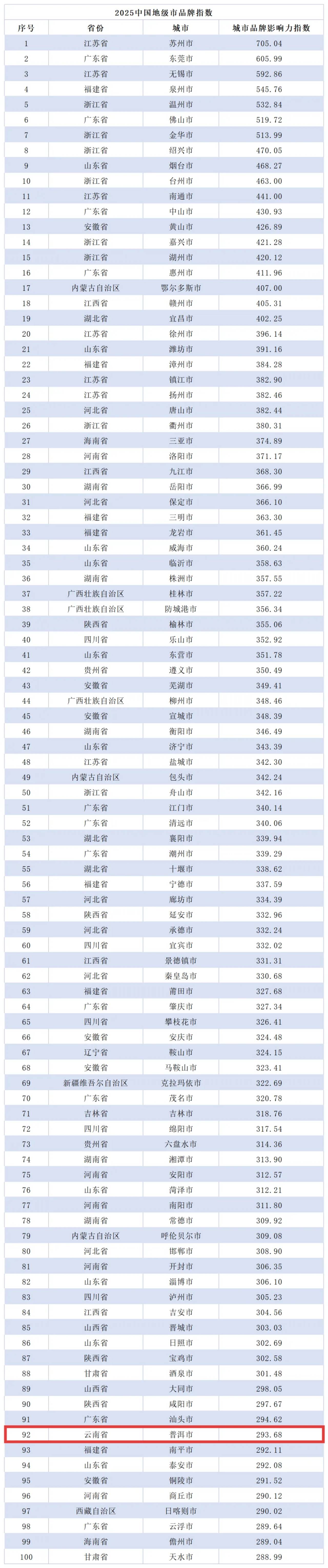 发布了2025全国地级市城市品牌指数(不含省会以上城市)前100名城市名单