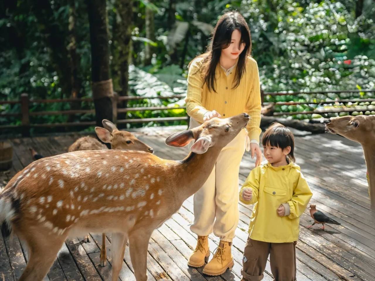 ▲游客在普洱太阳河森林公园森林与动物互动。