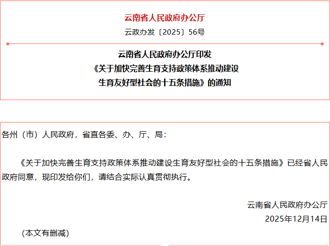 涉及二孩、三孩生育补贴等,云南印发15条措施→