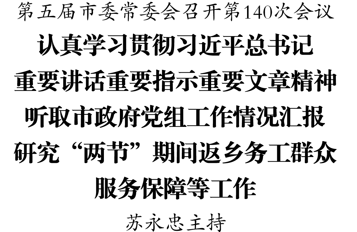 12月19日,第五届市委常委会召开第140次会议。12月19日,第五届市委常委会召开第140次会议,认真学习贯彻习近平总书记重要讲话重要指示重要文章精神,提出我市贯彻意见;听取市政府党组工作情况汇报,研究“两节”期间返乡务工群众服务保障、生态文明建设、苹果产业发展、职业教育等工作。