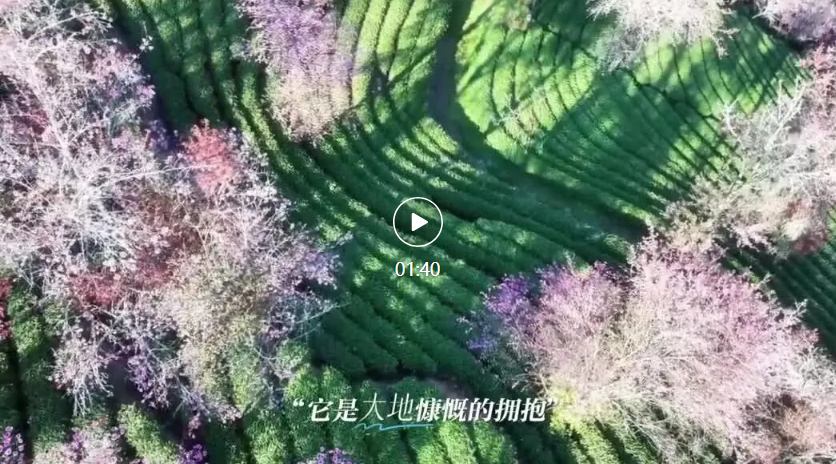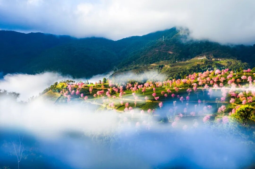 这里,千亩茶园绵延如浪,万株冬樱悄然绽放,粉霞缀满枝头,疏密有致地沿着茶垄铺展,墨绿与粉红交织,晨雾缭绕其间,宛如立体画卷。