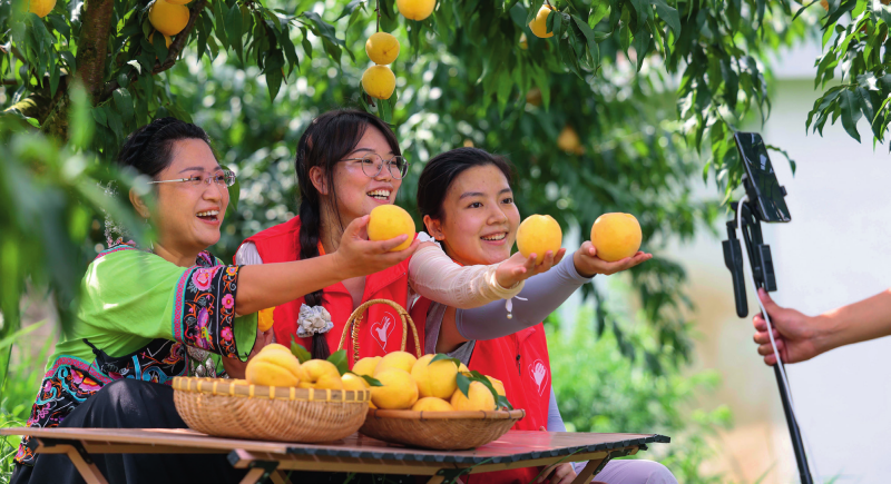 在贵州省铜仁市玉屏县亚鱼乡郭家湾村黄桃种植基地,青年志愿者通过直播帮助果农推销黄桃(2025年8月9日摄)新华社发(胡攀学摄)